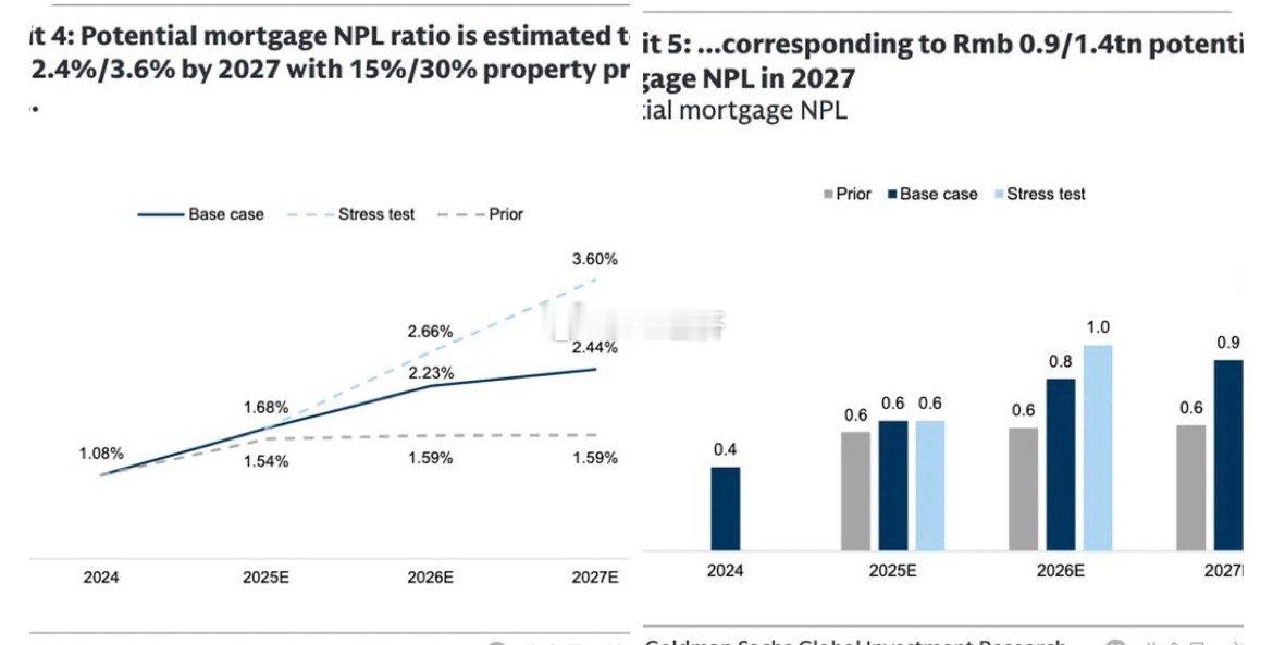 高盛(《中国银行业2026展望:重新评估房地产对银行的影响》 高盛基于2026至2027年房价累计下跌15%的基准情景预设显示,中国银行业抵押贷款不良生成率将在2025年触及0.73%的峰值,且受首付比例下调至15%的结构性推动,导致2027年全行业潜在不良率升至2.4%,体系内抵押贷款不良绝对额将达到0.9万亿至1.4万亿元的规模。银行体系需额外计提约0.5万亿元损失准备金以维持100%拨备覆盖,这种计提强度在当前主要表现为盈利能力的阶段性削减而非系统性资本金短缺。由于中国住房贷款具备完全追索权的法律特性,参考香港2000年信用周期经验,其实际信贷损失率将显著低于名义不良率。
