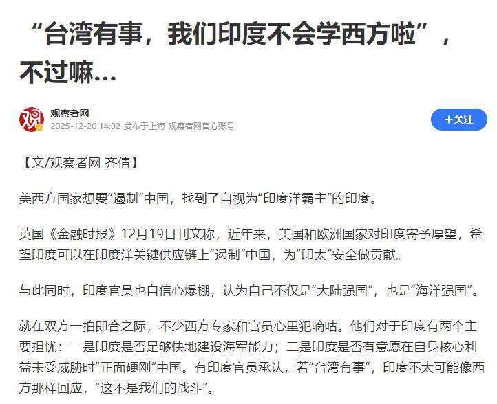 印度也开始给中国划红线了!眼看西方国家纷纷在台海问题表态后,印度也坐不住了! 据香港《卫报》12月21日消息,印度外长苏杰生近日就台海问题时表态,一旦中国武力攻台之时,中国想要让印度保持中立态度,中方就必须在中印边境问题上不能跨过印度所划的红线,否则印度会支持台湾。 印度这步棋,得从两国裤腰带上的钱、边境上的枪,还有印度洋里的船说起。2022年中印贸易1360亿美元,中国是印度第一大进口来源国,印度人手机里60%的零件、基建用的钢材、药厂的原料药,都得看中国脸色。 去年印度闹化肥荒,最后还是求着中国紧急供货。要是真为台海跟中国翻脸,德里街头的电价先得涨三成,班加罗尔的IT厂得停工,这买卖莫迪政府算得比谁都清楚。所以苏杰生话音刚落,印度财政部就悄悄给中企开绿灯,允许比亚迪在古吉拉特邦扩建工厂,嘴上喊打,身体很诚实。 再说枪,中印边境2000公里,印度囤了20万大军,但后勤全靠牦牛和骡马。去年冬天加勒万河谷对峙,印度士兵冻伤截肢的照片满天飞,反观中国这边,高原机场、铁路直通前线,歼-20巡航常态化。 印度陆军参谋长私下承认:"在边境搞摩擦可以,但真要两线作战,我们连三个月的弹药都撑不住。"所以苏杰生的"支持台湾",本质是想用台海话题,给边境谈判加筹码,就像菜市场大妈说"你便宜点,不然我去别家买",可兜里的钱只够买这家的菜。 最关键的是印度洋的船。中国60%的能源、90%的中东贸易都要过印度洋,印度盯着这条生命线,以为能卡脖子。但现实是,中国在瓜达尔港、吉布提的基地早已形成反制,去年还帮斯里兰卡建了科伦坡港口城。 印度海军号称有150艘军舰,可一半是苏联时代的老古董,国产航母"维克兰特"号试航十年还在漏水。前阵子印度在马尔代夫搞军事存在,结果新政府上台直接赶人,所谓"印度洋宪兵"连家门口都摆不平。 印度这招其实是学美国的"极限施压",可惜学了皮毛没学里子。美国敢拿关税威胁中国,是因为有美元霸权兜底,印度呢?去年被美国加征25%钢铝关税,国内车企立刻闹罢工,最后只能乖乖让步。现在想用台海问题讹诈中国,却忘了1962年的教训,当北京决定"打疼印度"时,新德里连动员全国的能力都没有。 更深层的,是印度的战略焦虑。莫迪政府想当"有声有色的大国",可北边被中国压住,南边被印度洋的小国嫌弃。去年在G20峰会,印度想把"中印边界争议"塞进联合声明,结果被所有国家无视,连美国都知道,台海是中国核心利益,印度边境问题只是区域性摩擦。这种国际现实,让印度只能在台海问题上玩"边缘政策":既不敢真支持台独,又想借题发挥要好处。 看透了这些,就知道印度的"红线"本质是纸老虎。去年中印军长级会谈,印度要求中国后撤20公里,中方直接亮出新式车载炮部署图,印军当天就撤回谈判桌。现在台海局势紧张,印度军方悄悄把藏南的驻军调回平原,他们比谁都清楚,真要惹怒中国,别说台湾,自家东北部七个邦都可能不稳。 说到底,印度的小聪明藏着大糊涂。它以为能用台海问题牵制中国,却忘了自己的经济命脉、边境安全、印度洋野心,样样都攥在中国手里。就像邻居家的熊孩子,举着玩具枪喊"你不退让我就哭",可兜里揣着人家给的糖果,这种吓唬人的把戏,北京见得多了。 等印度哪天明白"边界问题换不来台海leverage",中印关系才能真正走出"打打谈谈"的怪圈。但至少现在,苏杰生的狠话,不过是莫迪政府在大选年的一场秀而已。