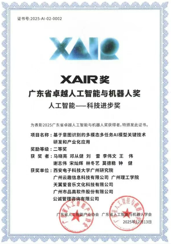 上证报中国证券网讯(记者王子霖)据品高股份官方公众号12月22日消息,近日,由品高股份联合西安电子科技大学广州研究院、广州云趣信息科技有限公司、广州理工学院、天翼爱音乐文化科技有限公司、公诚管理咨询有限公司等单位共同申报的《基于意图识别的多模态多任务AI模型关键技术研发和产业化应用》项目,荣获2025年度XAIR奖“人工智能——科技进步奖”二等奖。