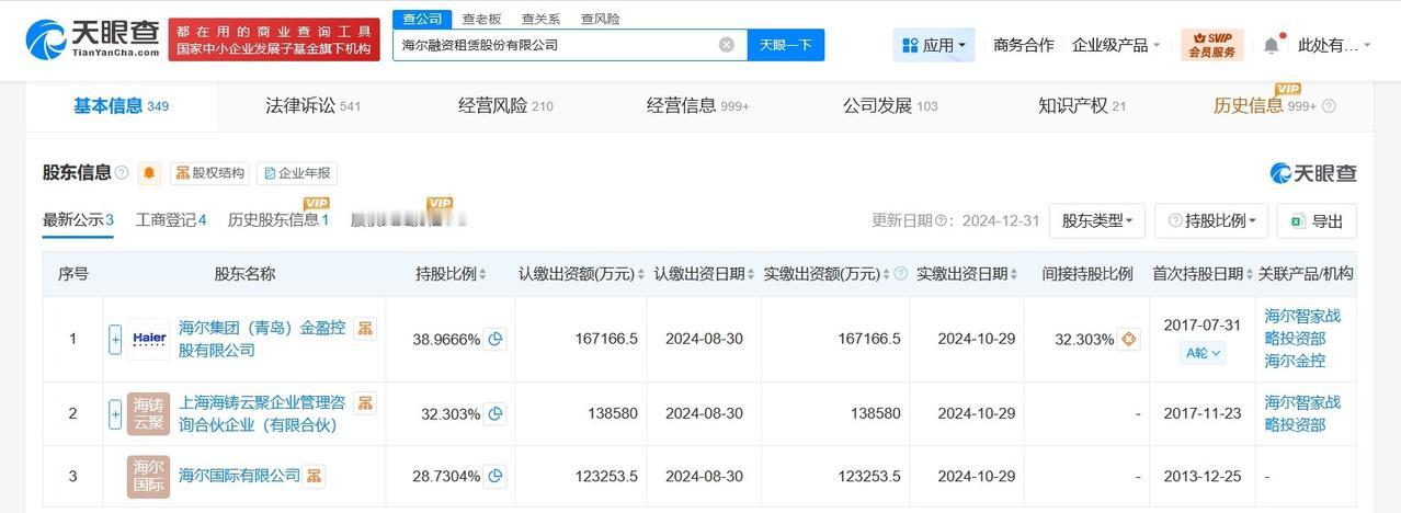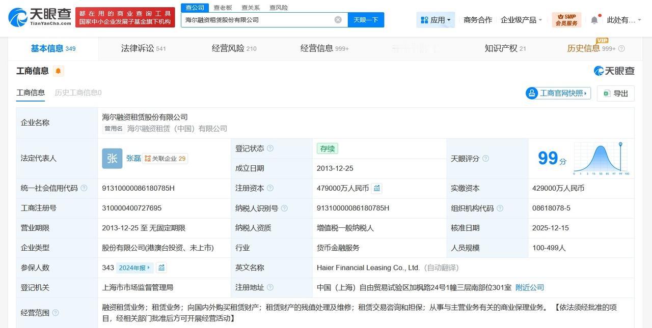 海尔融资租赁公司增资至47.9亿增幅约12% 天眼查App显示,近日,海尔融资租赁股份有限公司发生工商变更,注册资本由42.9亿人民币增至47.9亿人民币,增幅约12%。 该公司成立于2013年12月,法定代表人为张磊,经营范围为融资租赁业务、租赁业务、向国内外购买租赁财产、租赁财产的残值处理及维修、租赁交易咨询和担保、从事与主营业务有关的商业保理业务。股东信息显示,该公司由海尔集团(青岛)金盈控股有限公司、上海海铸云聚企业管理咨询合伙企业(有限合伙)、海尔国际有限公司共同持股。 天眼查信息: