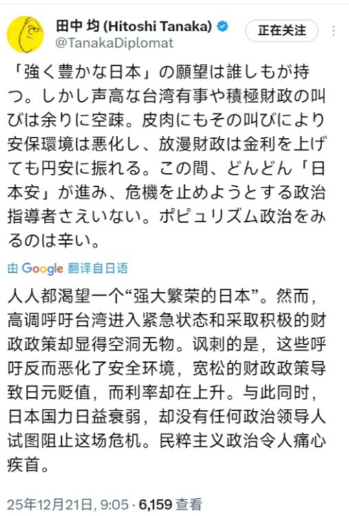 日本著名外交官、前外务副大臣田中均12月21日发文写道:“人人都渴望一个‘强大繁荣的日本’。然而,高调呼吁台湾有事和采取积极的财政政策却显得空洞无物。讽刺的是,这些呼吁反而恶化了安全环境,宽松的财政政策导致日元贬值,而利率却在上升。与此同时,日本国力日益衰弱,却没有任何政治领导人试图阻止这场危机。民粹主义政治令人痛心疾首。” 田中均这话可以说戳中了日本当前的痛点,作为深耕外交领域多年的资深人士,他看问题的角度可比那些只会喊口号的政客通透多了。毕竟现在日本政坛的风气,就是谁喊的“安全口号”越响,谁越容易拉到选票,可这些口号喊得再热闹,落到实处全是给老百姓添负担的麻烦事。 就说高调喊“台湾有事”这茬,根本不是什么空穴来风的表态,背后全是右翼政客的民粹算计。他们把台湾问题包装成“日本安全的关键突破口”,一边靠着煽动民众对周边环境的焦虑拉选票,一边借着这个由头跟美国绑得更紧,想提升自己在印太体系里的地位。可这种冒险的言论没给日本带来半点安全,反而先把外交和经济环境搞砸了。 要知道中国是日本最大的贸易伙伴,也是旅游业的重要客源,就因为这些不当言论,中日之间的人文交流和经贸合作都受了实质性影响,官方都发了赴日旅游和留学的提醒,有专家估算要是中国游客减少的情况持续到明年,日本旅游业的损失就得高达90亿美元。 接着再看那些号称能提振经济的积极财政政策,说穿了就是“花钱买吆喝”的空洞套路。现任首相高市早苗延续了类似安倍经济学的思路,把扩张型财政当核心抓手,11月份刚推出高达21.3万亿日元的综合经济政策,号称是疫情以来最大规模的刺激计划。 可市场根本不买账,政策一出台就引发了股债汇“三杀”,日经指数跌破49000点大关,10年期国债收益率涨到2008年金融危机以来的最高水平,日元汇率更是跌到157的低位,眼看就要触及160的干预警戒线。 更要命的是宽松财政没拉动经济就算了,还直接把日元拖进了贬值泥潭,倒逼央行不得不加息应对。12月19日日本央行刚把利率上调到0.75%,这可是30年来的最高水平,标志着日本近三十年的超宽松货币政策彻底告别。 可加息也没能挽救日元,反而让中小企业的日子更难过了,东京有家生产精密零件的电器公司就吐槽,之前借款利率才1%左右,现在新签的贷款利息都突破2%了,再加上员工薪资上涨,经营压力直接翻倍。 对普通家庭来说也不是好消息,利率上涨后每个有贷款的家庭每年要多花1.8万日元,这点额外支出在高通胀背景下,无疑是雪上加霜。 偏偏当前日本的国力根本扛不住这种折腾,经济数据已经亮了红灯。2025年三季度实际GDP按年率算下降1.8%,是六个季度以来首次负增长,外需对经济的贡献直接转负,对美出口连续七个月萎缩,民间住宅投资跌幅更是超过三成。 核心通胀指标已经连续50个月同比上升,11月剔除生鲜食品的CPI还涨了3%,远超央行2%的目标,超市里的生活用品价格涨个不停,老百姓的购买力被不断侵蚀。更深层的问题是少子老龄化加速、劳动力短缺这些结构性积弊,让日本的潜在经济增长率长期徘徊在0.1%到0.9%之间,经济活力越来越弱。 最让田中均痛心的是,面对这样的危机,日本的政治领导人不仅没想着止损,反而在民粹主义的道路上越走越远。现在的政客们热衷于制造“外部威胁”的危机叙事,把“台湾有事即日本有事”当口头禅,目的就是让民众接受原本难以认同的军费扩张。 高市政府已经计划提前实现“防卫费占GDP 2%”的目标,还专门划拨1.7万亿日元用于强化防卫能力,在财政本就紧张的情况下,这些军事开支必然会挤压教育、医疗、养老等民生预算,让社会不平等问题进一步恶化。 这种靠制造恐惧凝聚民意、靠牺牲民生推进军事扩张的套路,在日本历史上已经有过惨痛教训,可当前的政治环境里,没人愿意站出来踩刹车。 人人都盼着日本能强大繁荣,可现在的日本却在错误的道路上越走越偏。高调的涉台言论恶化了安全环境,空洞的财政政策搞垮了经济,民粹化的政治又堵死了纠错的可能,田中均的痛心疾首,恰恰道出了当下日本最真实的困境。
