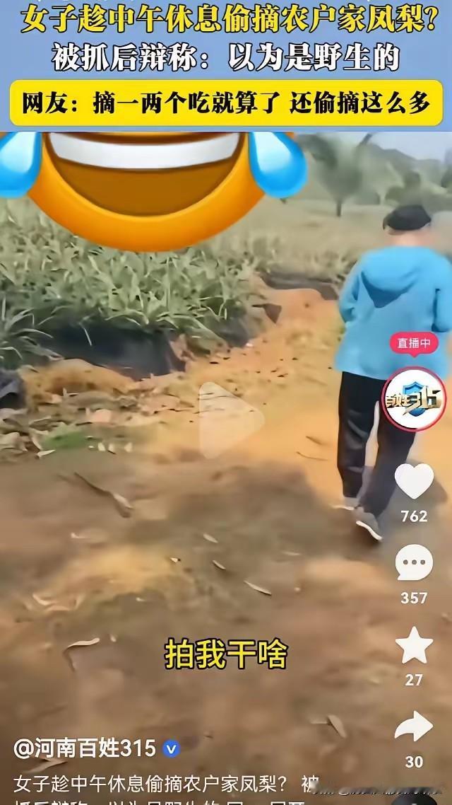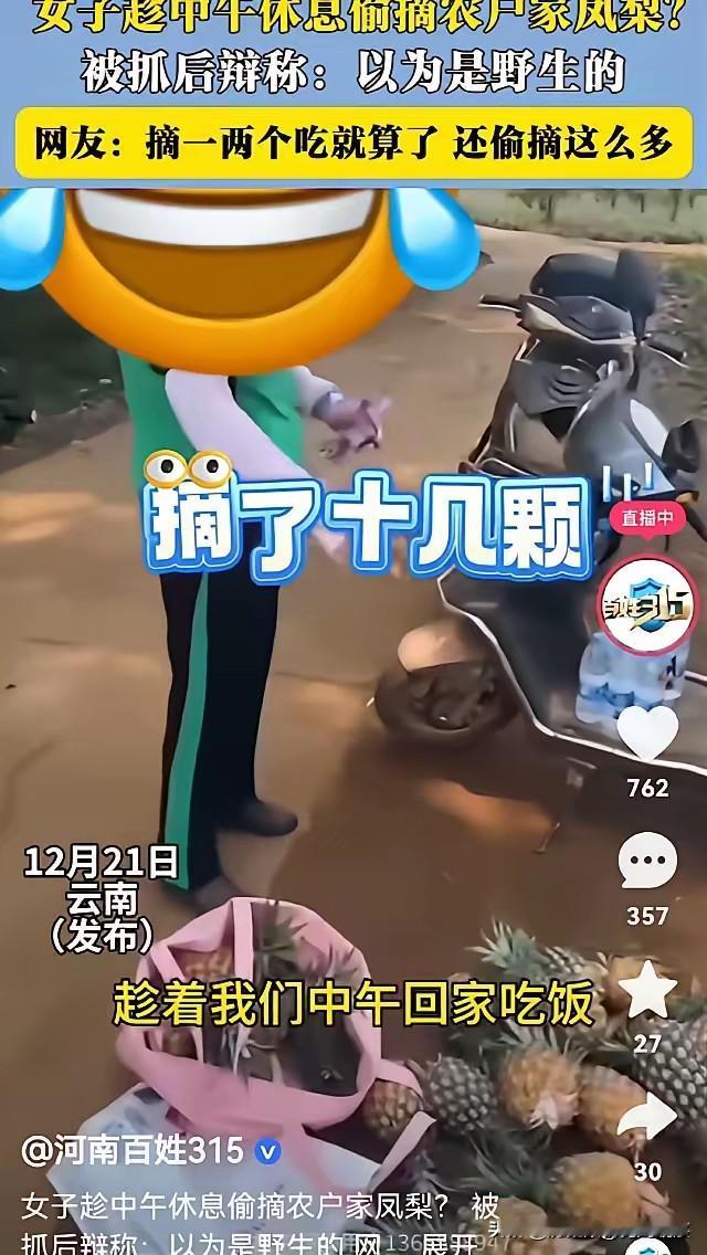 【偷凤梨还嘴硬!云南两女子“野生”借口遭怒怼,结局太解气】 云南一农户小李(化名)中午回家吃饭,刚到地头就发现不对劲——两名外地来过冬的女子,正背着鼓鼓的袋子在自家凤梨地里“扫荡”,看样子是想多偷点带回去。 小李立刻上前制止,俩女子被抓现行却毫无心虚,先是说“自己买的”,被小李要求三方对质时,又改口称“这些凤梨都是野生的”。 小李气得哭笑不得,当场怒怼:“我这片几十亩凤梨,年年精心种植、施肥浇水,没人管能长这么好?你见过连片野生凤梨吗?” 俩女子被怼得哑口无言,只好把偷的凤梨全放在地上。 小李没惯着,拿起砍刀几下把凤梨砍碎,俩女子见状吓得撒腿就跑,连头都不敢回。 提醒:不管是凤梨还是其他农作物,都是农户的心血与合法财产,偷摘属于盗窃行为。根据《治安管理处罚法》,盗窃公私财物将面临拘留和罚款;若数额较大,还可能触犯《刑法》构成盗窃罪,承担刑事责任。别为了贪小便宜,丢了人品还违法!大妈偷摘水果 偷果的代价 海南岛凤梨 素材来源于网络,侵权删除。