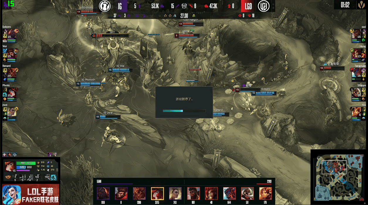 IG对阵LGD第一局比赛中,LGD基地网络发生波动随后暂停