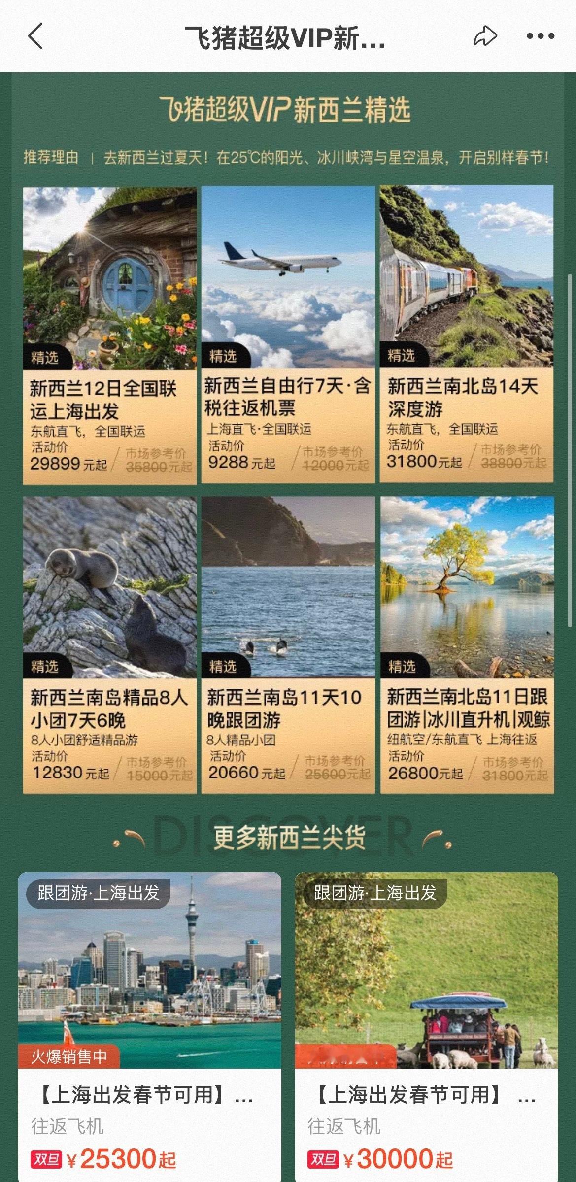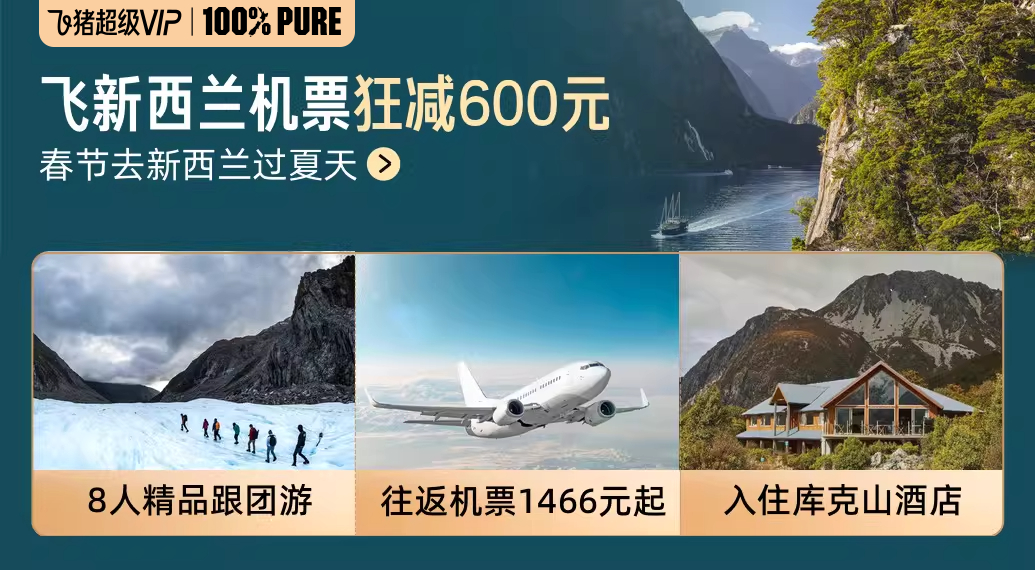 飞猪超级VIP享新西兰600元机票券谁说春节只能宅家挨冻?去新西兰过夏天啊!徒步、撸羊驼、追星空,飞猪66抵600券直接省机票钱,直播间藏着神秘低价套餐,约上搭子说走就走超爽~