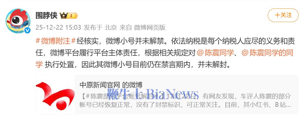 官方称,经核实,微博小号并未解禁。依法纳税是每个纳税人应尽的义务和责任,微博平台履行平台主体责任,根据相关规定对@陈震同学、@陈震同学的同学执行处置,因此其微博小号目前仍在禁言期内,并未解封。