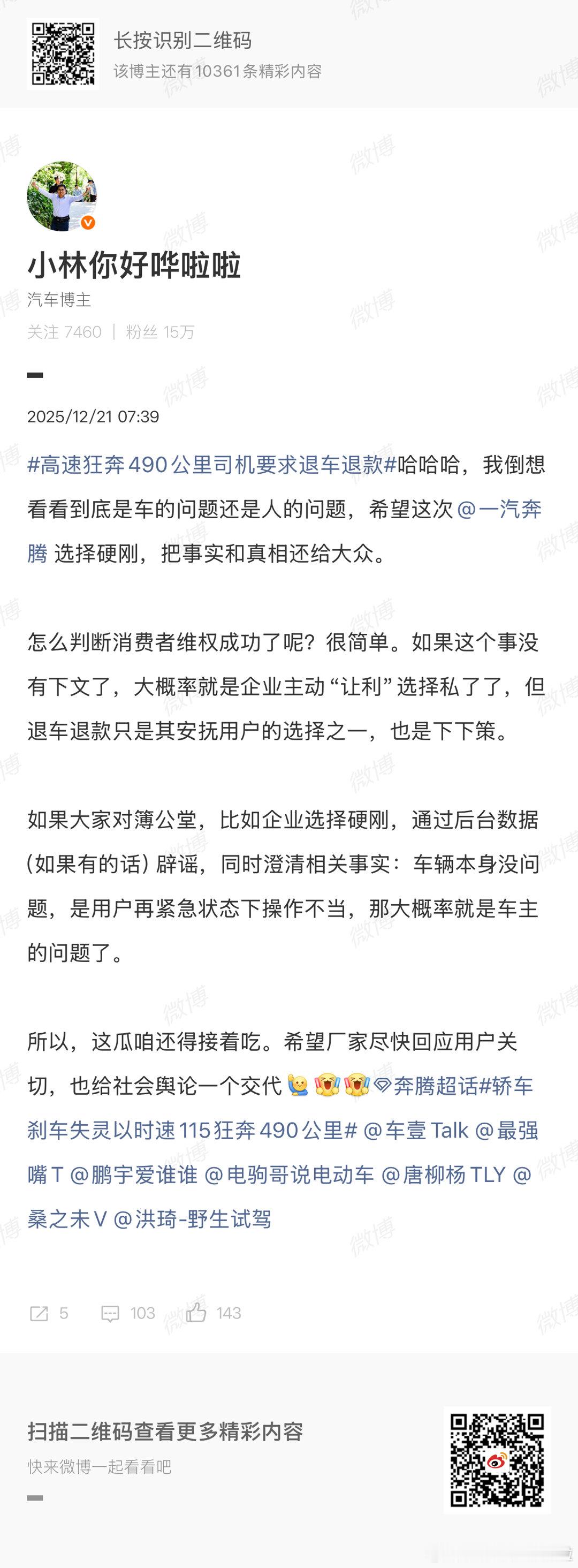 一汽奔腾别说我看不起你到底是不是车的问题啊?你上来就退车赔款?我们都觉得🚘出问题的概率不大,为啥你都不选择硬刚一下就自己先跪了呢?你让买同款奔腾b70 老车主作何感想?你让力挺你的媒体情何以堪?你让几乎所有的燃油车企业和品牌怎么看你?奔腾选择退车赔款,核心意思是想大事化小息事宁人,但事实上既定负面影响已经造成。如果奔腾这个时候不选择硬刚而是“贪生怕死”,对于这个原本已经濒临边缘化的品牌,无异于在用户信任的茅草屋顶雪上加霜?你自己都觉得自己产品安全不过关,用户还怎么相信你能造出合格的产品?糊涂啊一汽奔腾,哀你不幸怒你不争。奔腾高速狂奔490公里司机要求退车退款轿车刹车失灵以时速115狂奔490公里 北京