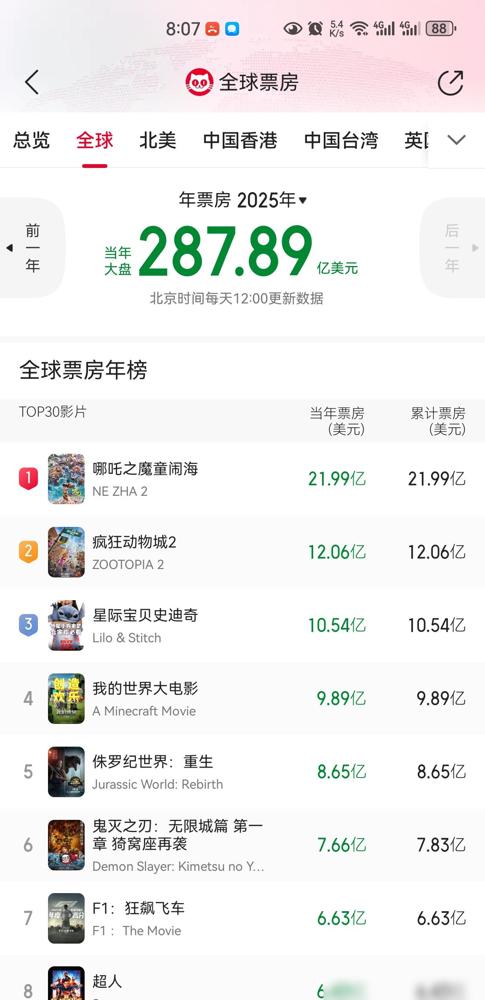 今年《哪吒2》年冠应该稳了,《疯狂动物城2》快接近尾声了,《阿凡达3》国内和国外票房都不理想。 谁能想到2025年的全球票房榜单会是这个格局,原本以为会有场龙争虎斗,结果《哪吒2》直接甩开了第二名快10亿美元,优势大得惊人。 我最在意的是,被寄予厚望的《阿凡达3》刚上映这几天的表现确实让人意外,国内预测最终才11亿左右,跟它前作那种横扫千军的气势比起来,落差感太强了。 反倒是《疯狂动物城2》在国内成了大爆款,预估能冲到40亿人民币,但在北美和海外其他地区的表现竟然还不如国内,这种“内外温差”确实少见。 再说回《哪吒2》,21.99亿美元的实绩确实太硬核了,目前稳坐全球第一,这个数据基本上已经提前终结了年冠的悬念。 我觉得现在的观众可能不再盲目迷信好莱坞大片了,即便像《阿凡达3》这种顶级IP,如果本土和海外市场都带不动,也很难再复刻当年的票房神话。 目前看来,这种断层式的领先让后边的追赶者非常吃力,年冠的位子大概率是坐实了。
