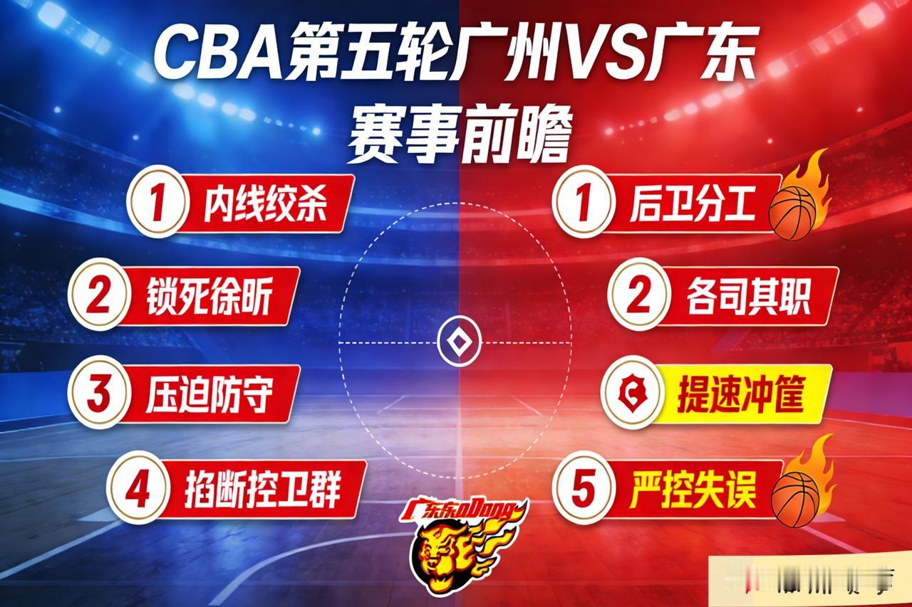CBA第五轮,广州与广东赛事前瞻,广东赢球要做到几点: 1. 内线绞杀战:把徐昕摁在“冰箱”里 别给徐昕任何舒服接球的机会!车轮战轮番消耗他的体能,绕前防守直接掐断外线喂饼连线,再配合协防封堵他的进攻路线,让这位广州内线高塔彻底沦为“蓝领工具人”,把他的得分死死按在个位数! 2. 压迫防守,掐断控卫群 全队贯彻全场压迫式防守,对郭艾伦、威金顿实施轮换盯防+针对性夹击,逼他们只能高难度强投、频繁出现失误,从源头上切断广州控卫群和内线的串联,让对手的进攻体系直接“熄火”。 3. 后卫分工,各司其职 徐杰坐稳“节奏大师”,专心控场+组织串联,稳住全队攻防脉搏;萨姆纳主打突破造杀伤+推转换快攻,撕开广州防线;奎因则专注外线防守施压,抓住空位机会贡献三分输出,三人各司其职、无缝衔接。 4.提速冲筐,严控失误 全力提速打快攻,必须绷紧“少失误”这根弦,杜绝浪传和无脑强突,用高效进攻和稳健失误控制,牢牢掌握比赛主动权。