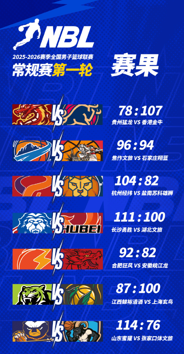 配文:2025-2026赛季NBL常规赛首轮最后两场比赛战罢,江西鲸裕清酒87:100不敌上海玄鸟,山东蜜獾114:76大胜张家口体文旅。