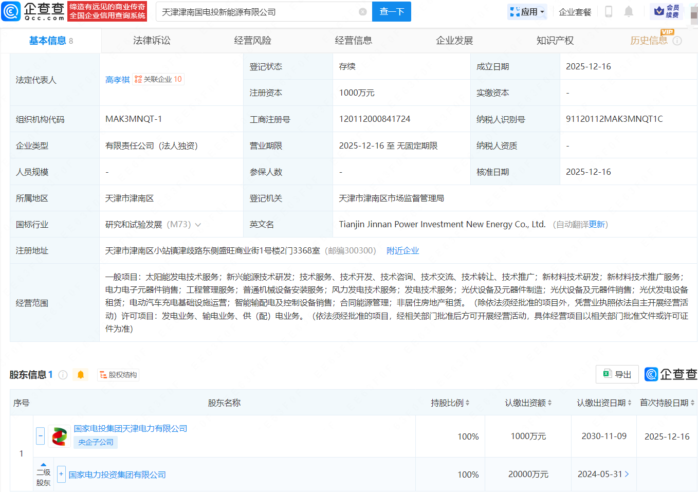企查查APP显示,近日,天津津南国电投新能源有限公司成立,法定代表人为高孝祺,注册资本1000万元,经营范围包含太阳能发电技术服务、新兴能源技术研发、发电技术服务等。企查查股权穿透显示,该公司由国家电力投资集团有限公司间接全资持股。