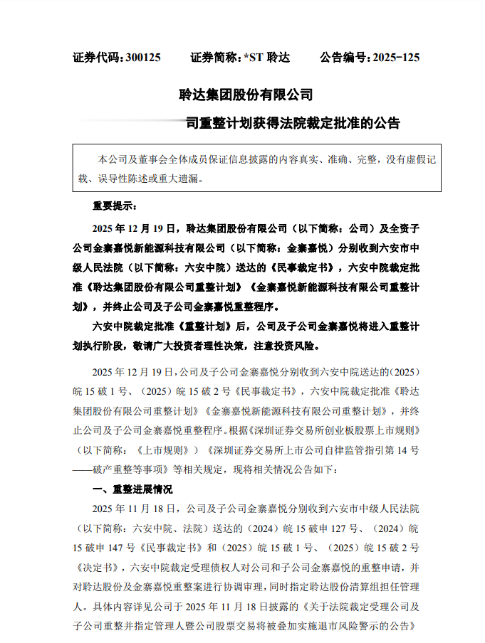 2025年12月19日,聆达集团股份有限公司(*ST聆达,300125)迎来关键转折点。安徽省六安市中级人民法院正式裁定批准公司及核心子公司的《重整计划》,标志着这家陷入困境的上市公司在法律层面踏上了再生之路,成为2025年度第十家重整计划获法院批准的A股公司。衡财保·炜衡金融315团队的邓律师表示,因*ST聆达信息披露违规而遭受投资损失的投资者而言,是一则利好消息。按照相关法律,符合条件、持有该股票的受损投资者,积极参与重整程序有望获得赔偿。