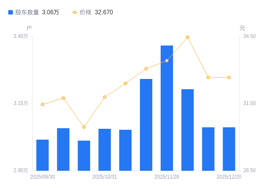 近一年(2024年12月20日至2025年12月20日),新余国科A股股东户数从2.47万户,增加至3.06万户,增幅23.89%,区间股价上涨17.01%。