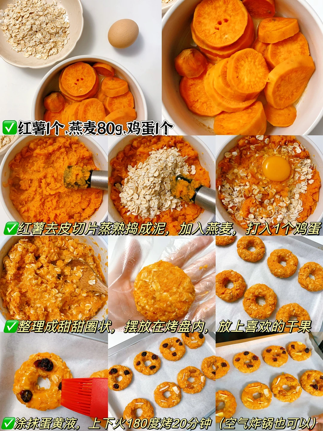 [飞吻R]hi,姐妹们,我又来分享减脂餐啦❗进入主页🈶很多有手就会的家常减脂餐~~ …………………………………………………………………… ✨✨减脂期也能吃的甜甜圈,红薯燕麦做的,低卡美味,红薯味很浓郁。。 [向右R]今日分享🔍 【红薯燕麦甜甜圈】 做法见图片(图[九R]) 食材:红薯,燕麦片,鸡蛋 ⚠️小tips: ✅红薯用碗蒸,蒸出来有水分 ✅燕麦用即食燕麦就可以 🕐时间:30-35分钟 ⭐难度:零厨艺✌️