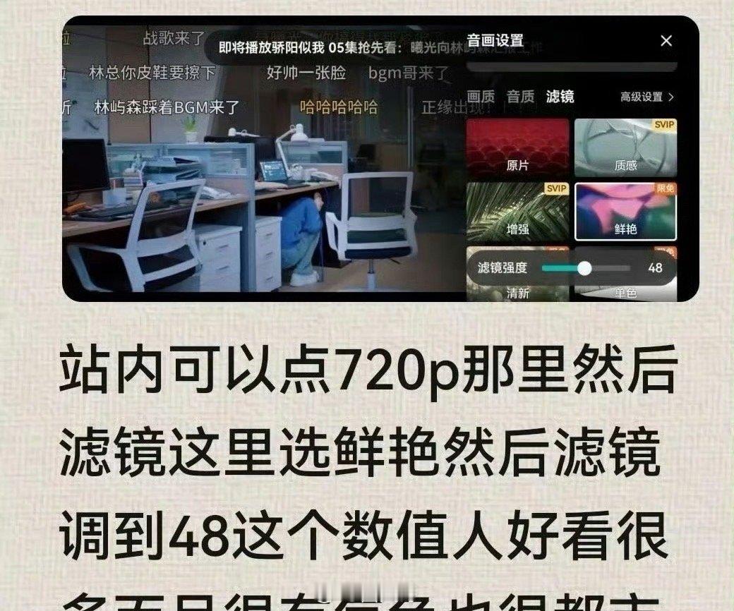 骄阳似我六种滤镜可以选没想到电视剧《骄阳似我》剧组还挺贴心的啊,居然提供了6种滤镜让观众选,就是说这样的现偶剧再内娱也是头一例吧,不得不说,赵今麦和宋威龙在剧中的状态还挺亮眼的,期待一个新剧开播热度啦~骄阳似我提供6种画面滤镜