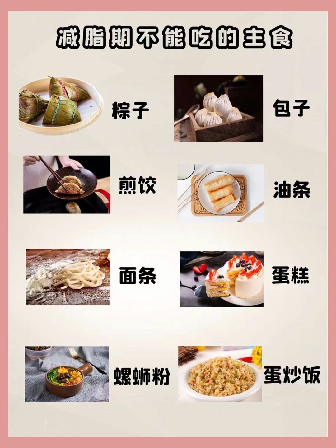 不能吃什么:包子,馄饨,蛋糕🍰,油条,螺蛳粉,蛋炒饭,煎饺,面条🍜等粉类。