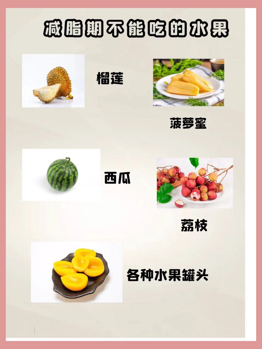 不能吃什么:西瓜🍉,榴莲,菠萝蜜,荔枝,芒果🥭,葡萄🍇等糖分、热量都偏高,减脂尽量不要吃。