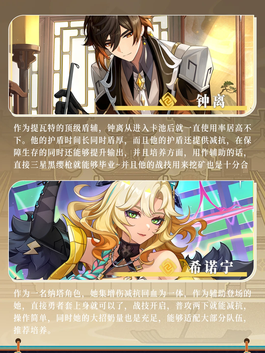 5.5版本值🉐培养的岩系角色推荐 分别是盾辅钟离+辅助希诺宁