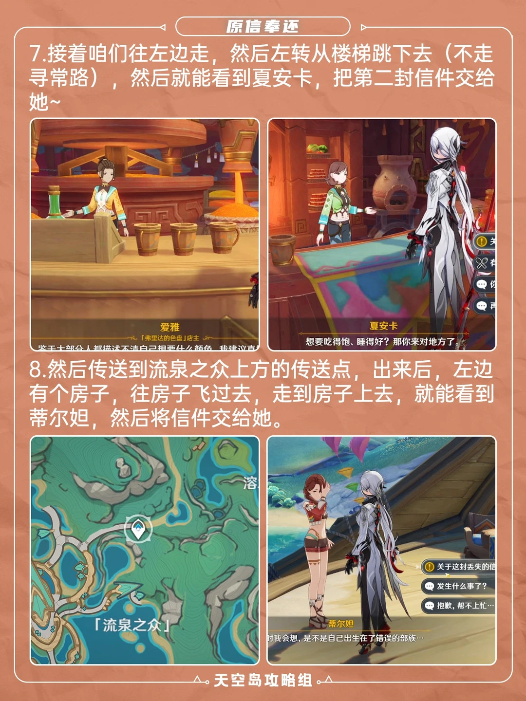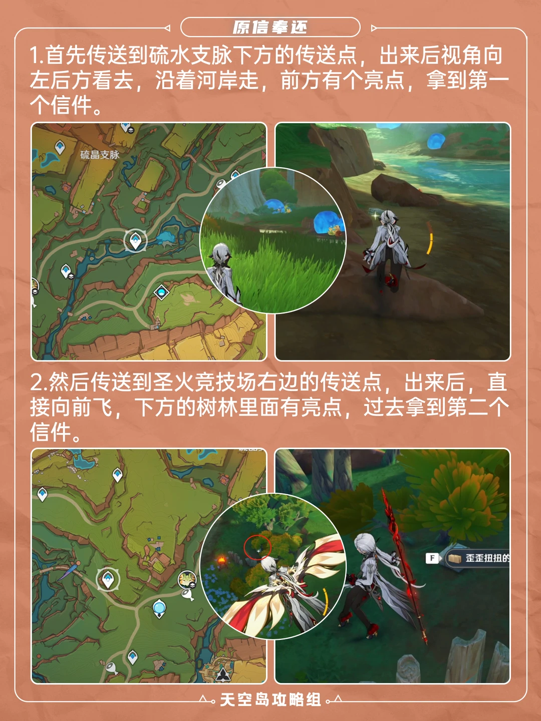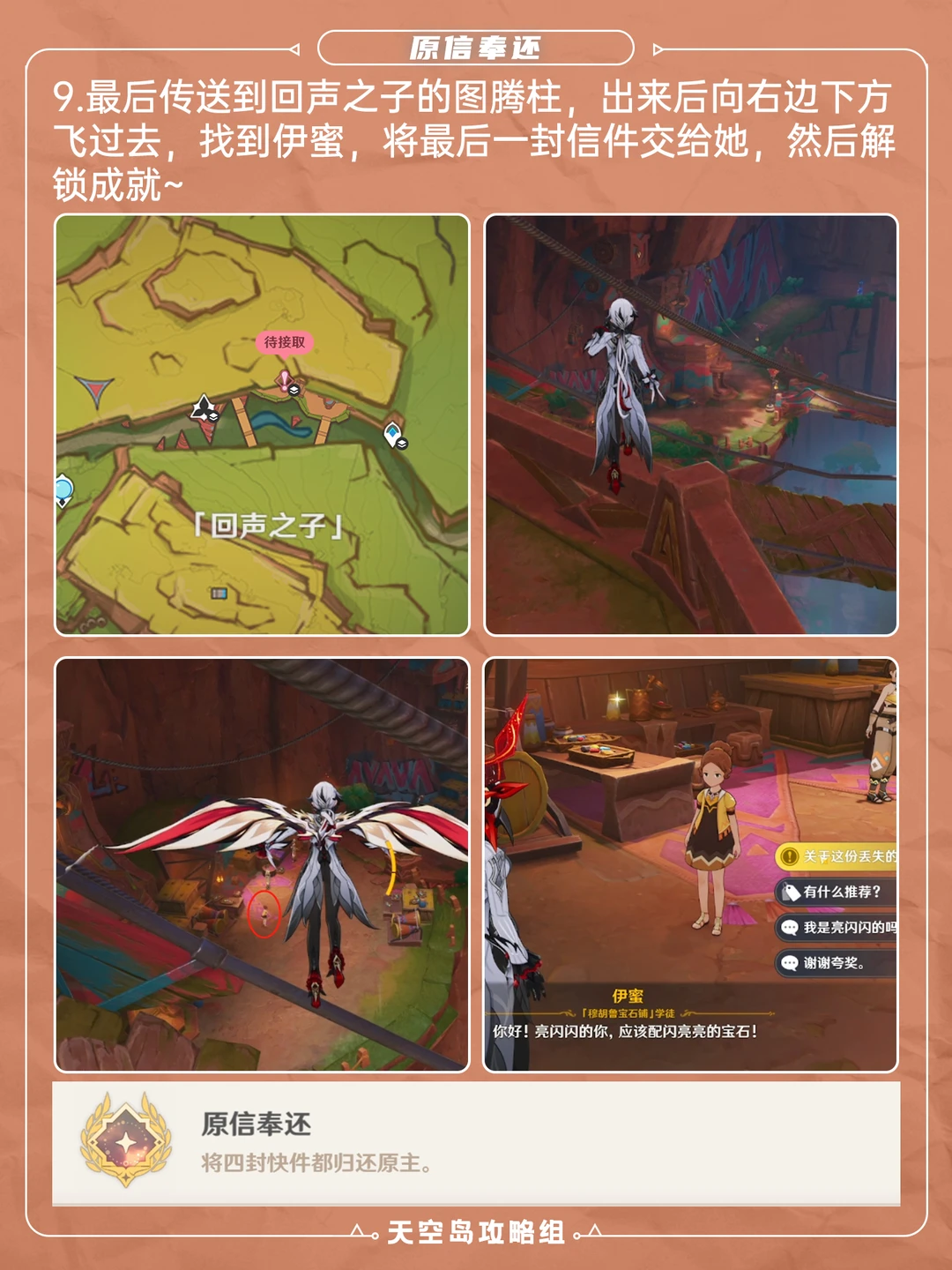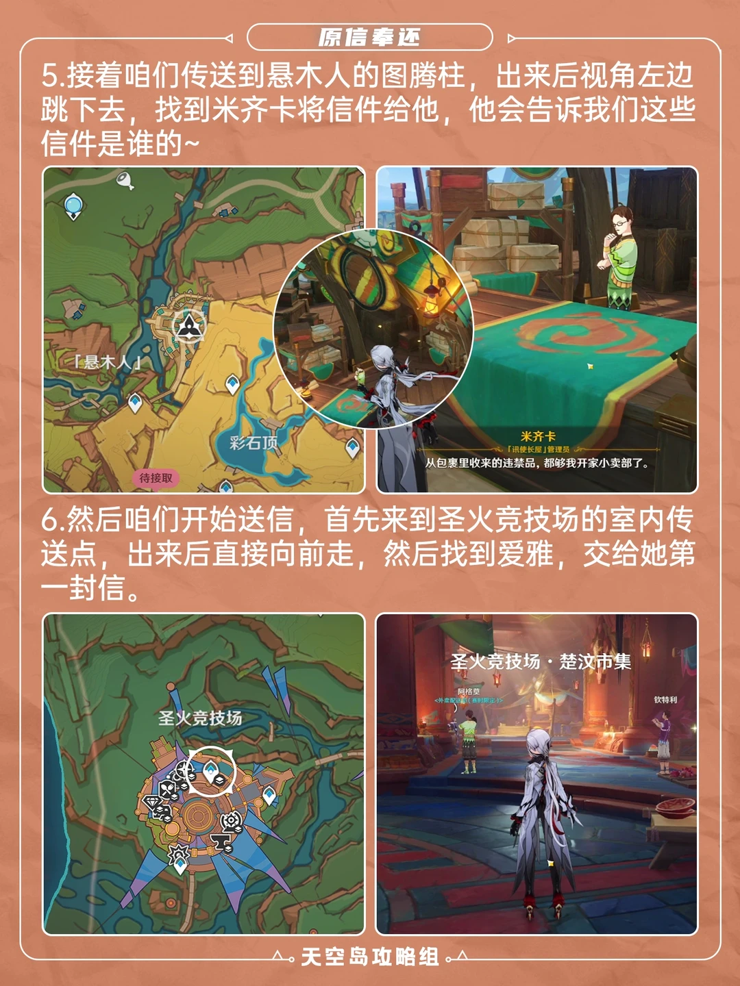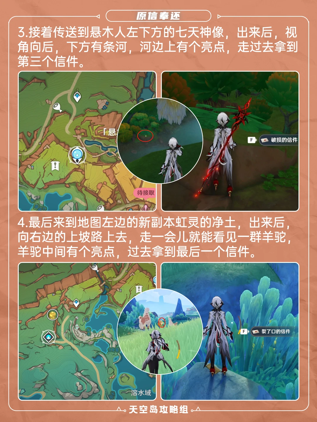 5.0版本纳塔新增成就「原信奉还」攻略[哇R] 一共四个信,需要收集并归还原主,具体位置可见图 ⭐如果之前已经找到信了,可在p4“米齐卡”处找到失主线索,信件分别对应的是: 伊蜜-「歪歪扭扭的快件」 蒂尔妲-「裂了口的信件」 爱雅-「污损的快件」 夏安卡-「破损的信件」