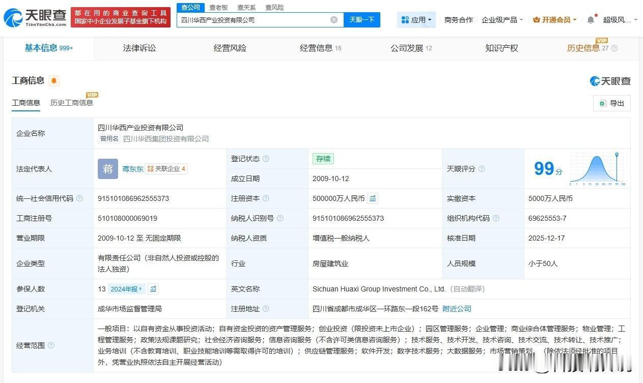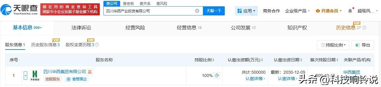 【华西集团投资公司更名为产业投资公司 注册资本增至50亿】 天眼查工商信息显示,近日,四川华西集团投资有限公司发生工商变更,企业名称变更为四川华西产业投资有限公司,注册资本由5000万人民币增至50亿人民币,增幅9900%。 该公司成立于2009年10月,法定代表人为蒋东东,经营范围包括以自有资金从事投资活动、自有资金投资的资产管理服务、创业投资等。股东信息显示,该公司由四川华西集团有限公司全资持股。 天眼查信息: