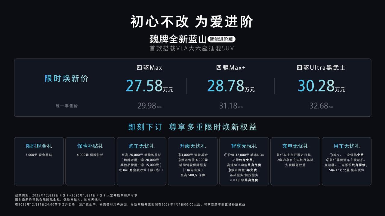 今晚,魏牌全新蓝山智能进阶版上市直接亮出诚意底牌!限时焕新价27.58万元起,对比29.98万元的统一零售价,入门版直降2.4万元,顶配黑武士版也仅需30.28万元,这个价格在中大型六座插混SUV里堪称“卷王”级别。更惊喜的是,购车还能享七大权益礼包,从5000元现金补贴、4000元保险补贴,到魏牌老用户2万元增换购补贴,再到城市/高速NOA功能终身免费,几乎把用车成本压到最低。 配置上更是拉满诚意,作为首款搭载VLA大模型的六座插混SUV,它能通过自然语音实现智驾交互,Hi4智能四驱电混系统带来4.9秒破百的性能,馈电油耗却低至6.5L/100km。3050mm轴距打造的六座座舱,第三排腿部空间达826mm,再加上三电系统终身保修的保障,27万级的价格能拿下这样的配置和服务,魏牌蓝山把“性价比”和“高端体验”做到了完美平衡。