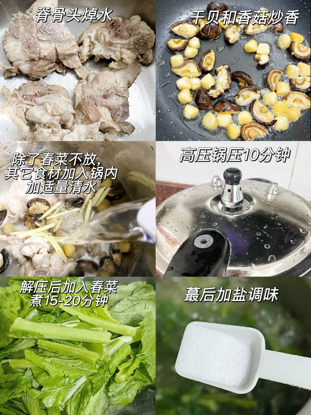 春菜是蔬菜中的“黄金菜”,富含维生素和膳食纤维,帮助消化又清🔥。坐月子时吃它,温和滋补不发胖;孩子吃它,增强免yi力长高高👶!关键是这一口汤清爽鲜甜。 准备食材🫕 春菜、干贝、脊骨、香菇、姜丝、胡椒粒 做法🥘 1️⃣香菇切条,胡椒粒压碎,其它食材也洗净切好。 2️⃣脊骨头先焯水,干贝香菇也炒香,把脊骨、干贝、香菇、胡椒粒、姜丝加入锅内,高压锅压10分钟。 3️⃣ 解压后加春菜煮15-20分钟,再加入盐调味即可。 💡小贴士:春菜煮久了会软,喜欢脆口的最后5分钟加!