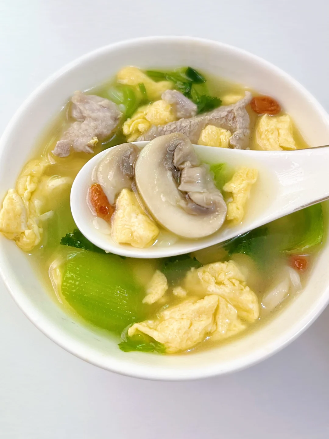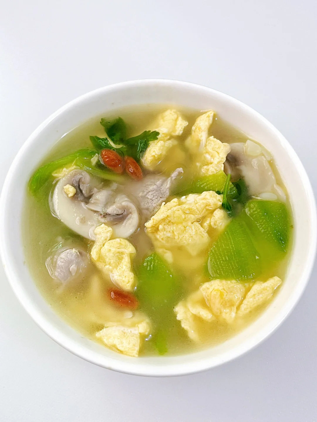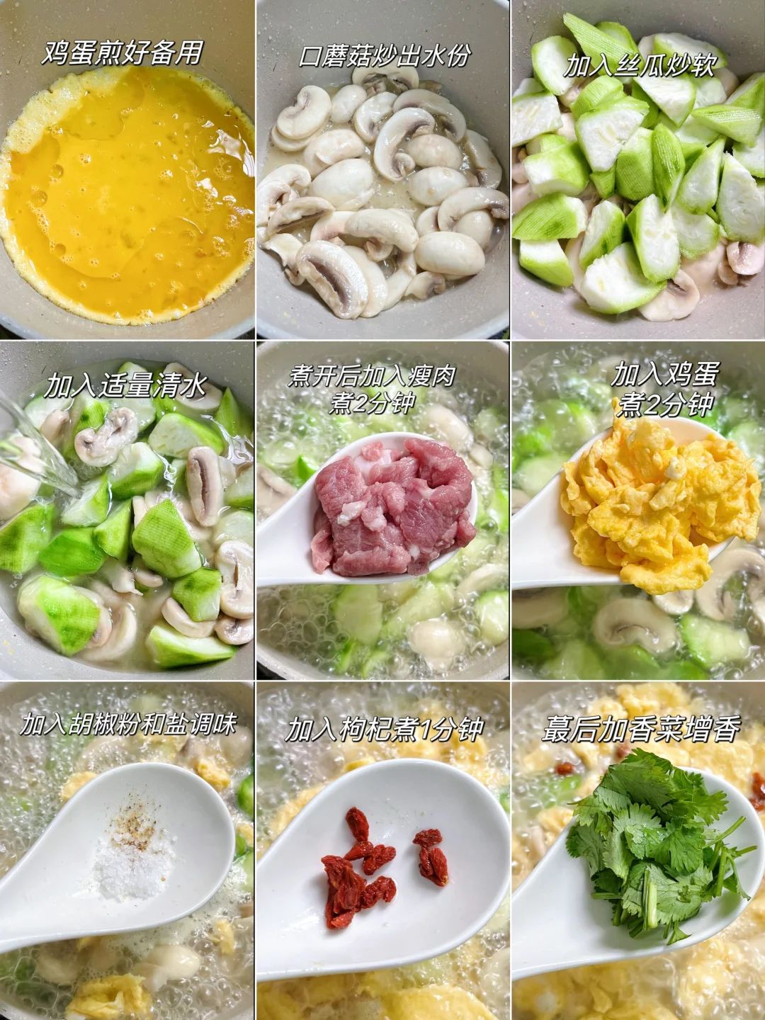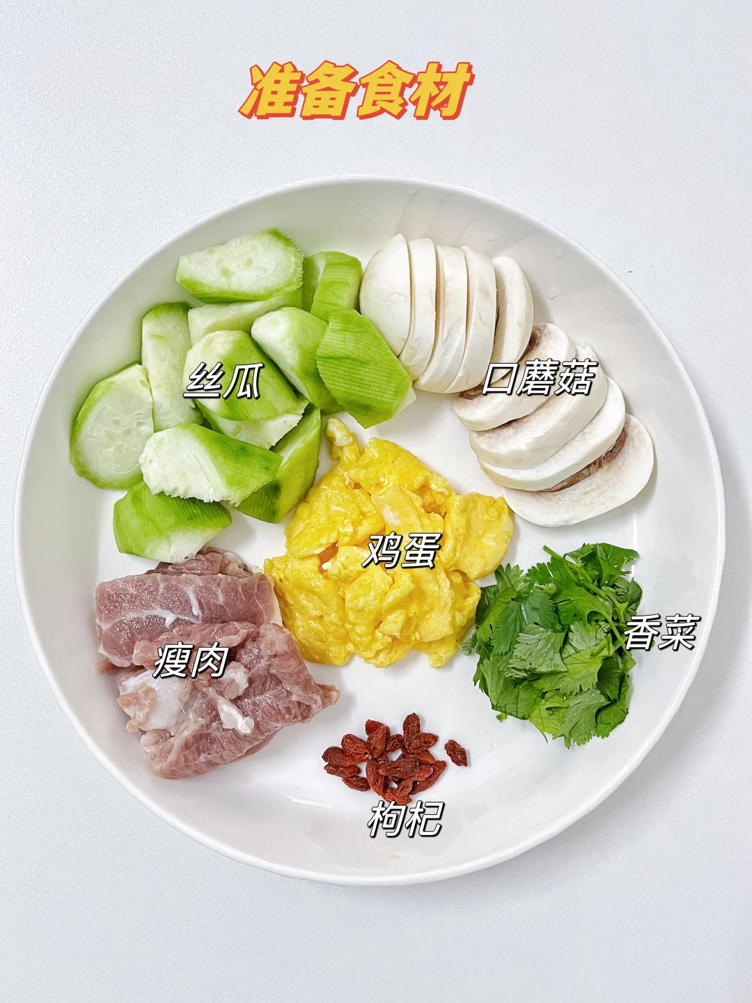 丝瓜、鸡蛋、口蘑菇、瘦肉、枸杞、香菜