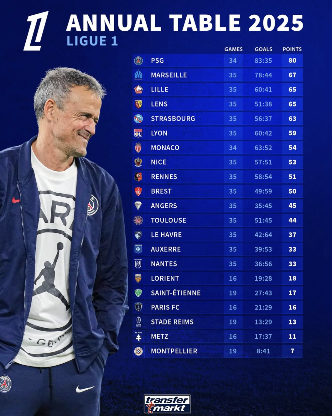 巴黎以80分高居榜首;马赛和里尔分别以67和65分排名二三。本赛季暂居积分榜首位的朗斯排名第四。
