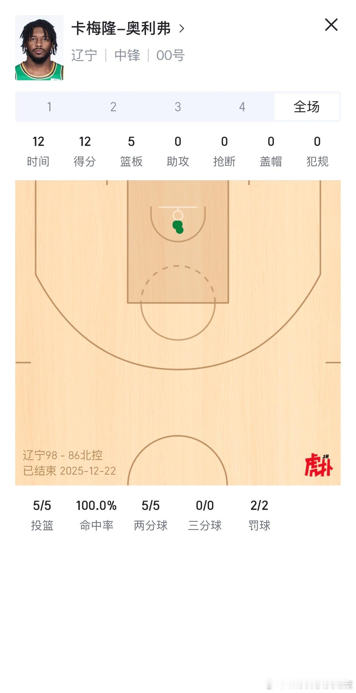 全场5投5中 罚球2中2得到12分5篮板奥利弗今天也证明了自己辽宁男篮vs北控男篮