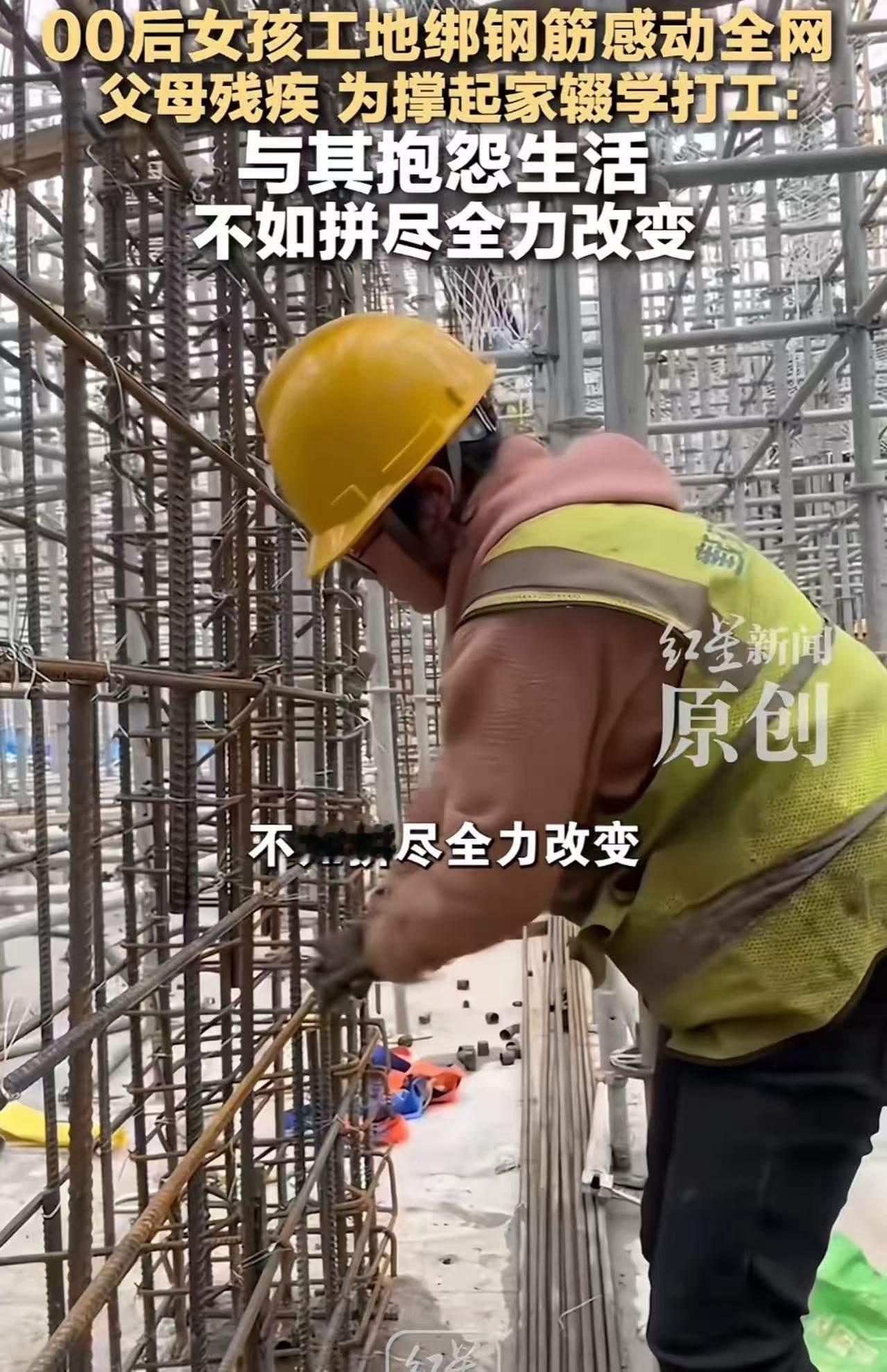 00后女孩去工地应聘绑钢筋的活,工人嘲笑她不自量力,可女孩却用实力让工头把她的日薪从200涨到320块钱,硬是把家里的担子全扛了起来!有人问女孩为什么这么拼,女孩说:“父母残疾,家里困难,与其抱怨生活,不如拼尽全力改变!” 清晨的第一缕阳光还在混凝土的尘土里打着转,成都郊外某大型工地的风像铁丝一样凉。钢筋的叮当声、工友们的嗒嗒鞋跟声、还有远处机器的轰鸣,混成一首嘈杂的序曲。小刘把黄色安全帽扣紧,站在刚浇好的混凝土边缘,蓝色工作服在日光下显得有些刺眼。她不像那些工地里的“大叔们”那样满脸胡茬、满身油污,一看就像城里走出来的“文青”,却要在这片汗水与铁锈中证明自己。 初来时,工地里的大叔大哥哥们并不信任这个细皮嫩肉的姑娘。他们用眼神打量她,用嗓门里的笑声拆她的勇气。“小姑娘闹着玩呢?这活儿不是闹着玩,是要用力气和耐心。”还有人揶揄地说:“你这身板,能撑起家吗?后半辈子给谁当媳妇都要命大价钱的。”小刘没有反驳,只是把手中的钢筋和钳子握得更紧,像被打磨过的刀刃,静静地等待一个证明的机会。 第一周,汗水像泉水似的往外冒,手掌因为钢筋的棱角被磨出血泡,破了又长,厚厚的老茧悄悄替代了柔软。夜里回到临时的宿舍,灯光照在她的脸上,疲惫却没有放弃的痕迹。她没有对同伴诉苦,也没有对家人说起自己多么累,而是在心里默默记下每一个细小的细节:不同型号钢筋的切割角度、每根绑扎的标准间距、更安全地固定方式。她开始用时间换成果,用细节打磨信心。 五个月过去,小刘的名字开始在工地里流传。她用速度和精准把工作质量稳稳拉高,手上的老茧像是她的勋章。她绑的一捆捆钢筋,像一根根标尺,给施工队带来更高效的进度。工头张哥第一次真正站到她面前,认真地说:“你干活用力但不急躁,手法也越来越稳。你这日薪从200块涨到320块,值!”话音落下,现场一圈人静了一秒,又立刻爆出掌声和赞叹。原本嘲笑的目光,渐渐换作佩服的目光。 现在她不仅换取了更高的收入,更用行动改变了人们对她的刻板印象。有人问她为什么这么拼,她的回答简短而有力:“父母残疾,家里困难,与其抱怨生活,不如拼尽全力改变。”这句话像铆钉钉在了每一个人的心上。她的父母虽然不能自理,但她让他们的窗前灯火更亮,让弟妹的学费不再是悬在天上的风。她说过的那句话不是口号,而是日复一日的行动。 从那以后,工地上的人对她的态度慢慢改变。有人开始主动给她让最干净的区域、最安全的机器操作位置,甚至有年轻人主动来向她学习绑扎的细节、尺距的把握。她也不再是那个被嘲笑的“小姑娘”,而是一位用双手撑起家庭、用汗水换来未来的“硬核担当”。她的成长像一面镜子,照出了同龄人中那些容易被忽视的力量:坚持、专业、对家人无比的爱与责任。 如今,小刘己干5年,成为家里的顶梁柱。她不卖惨,不认命,用自己的成就回答那些偏见。她知道,生活的苦难不是用来抱怨的,而是用来战胜的。正因为她的存在,工地上那些曾经“躺平”或“矫情”的声音,开始重新审视自己的人生选择。她的故事像一面旗帜,在城市的角落里高高飘扬:只要肯拼,只要对家人有爱,就一定能把不可能变成可能。 当夜幕再次降临,站在宿舍窗前的小刘望着远处灯火璀璨的城市,心里有一种久违的踏实感。她知道,前路还很长,但她已经用实际行动把家里那份沉重的担子分担得更加轻一些。她也相信,未来会有更多像她一样的年轻人,敢于在平凡的岗位上绽放出不平凡的光芒。愿每一个在生活底色里打拼的人,都能从她的故事里找到自己的勇气。 你身边有没有小刘这样被现实生活所迫,用弱小的身躯撑起一片天的人?在隐藏的岗位上默默发光的人?他们的坚持真正在00后孩子们中竖起一面坚忍的旗帜,又在你心里点亮了什么?欢迎在评论区分享你的故事和感受。工地打工女孩 工地钢筋女工
