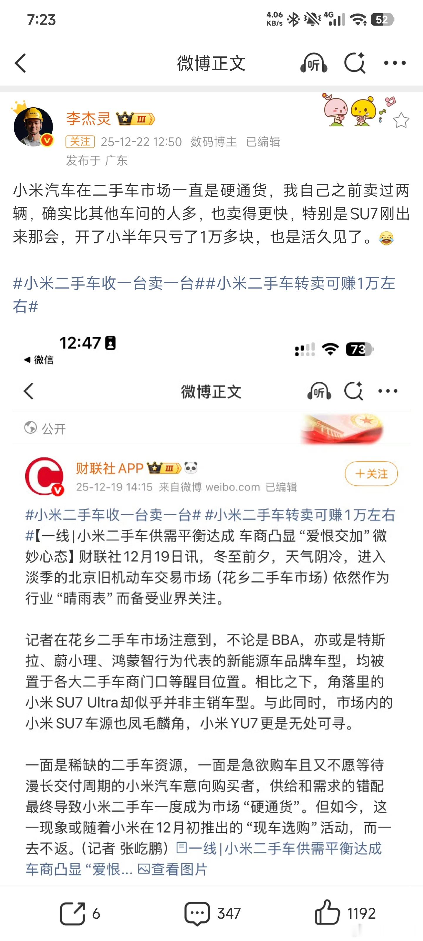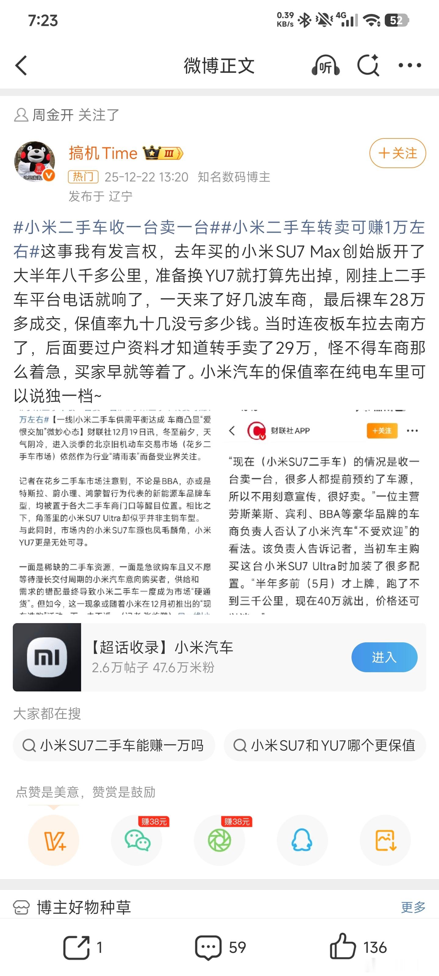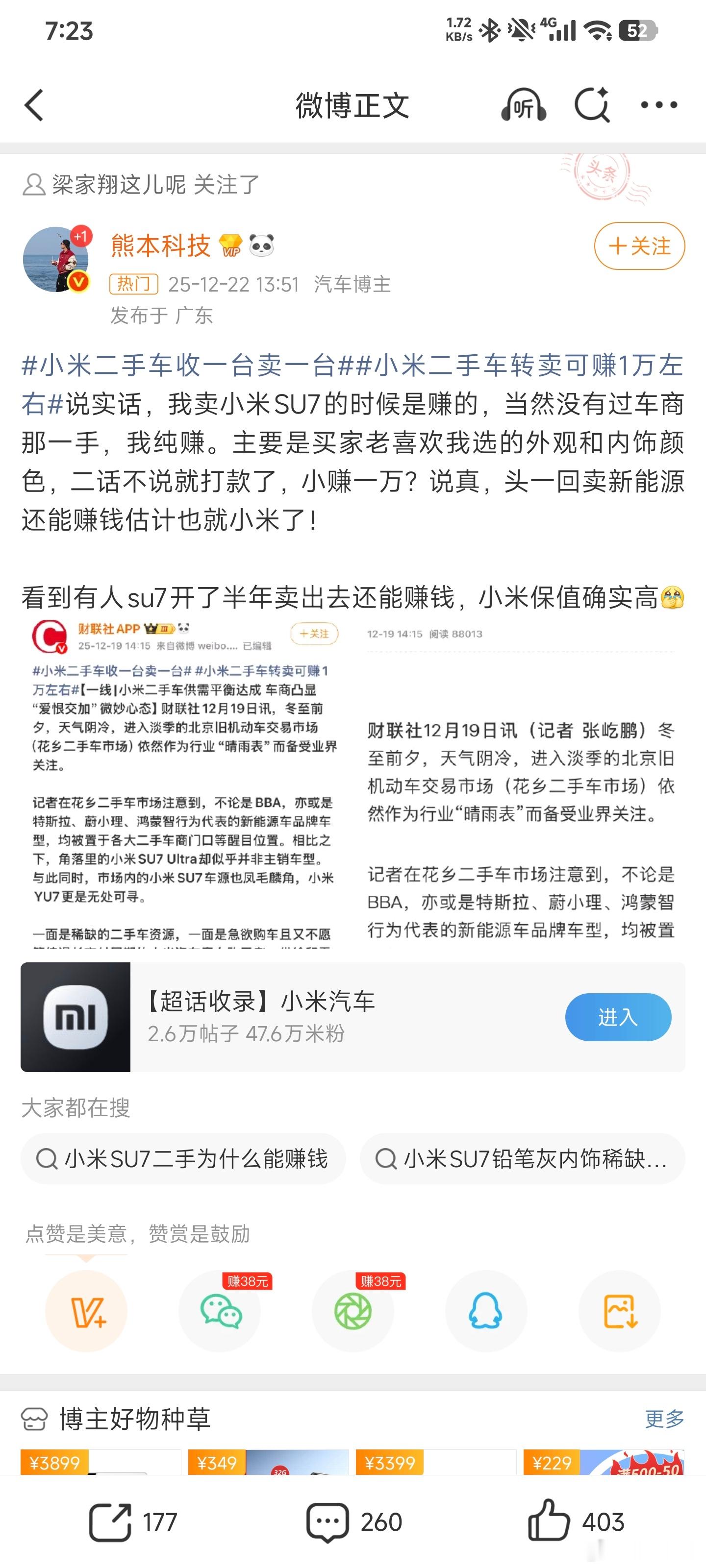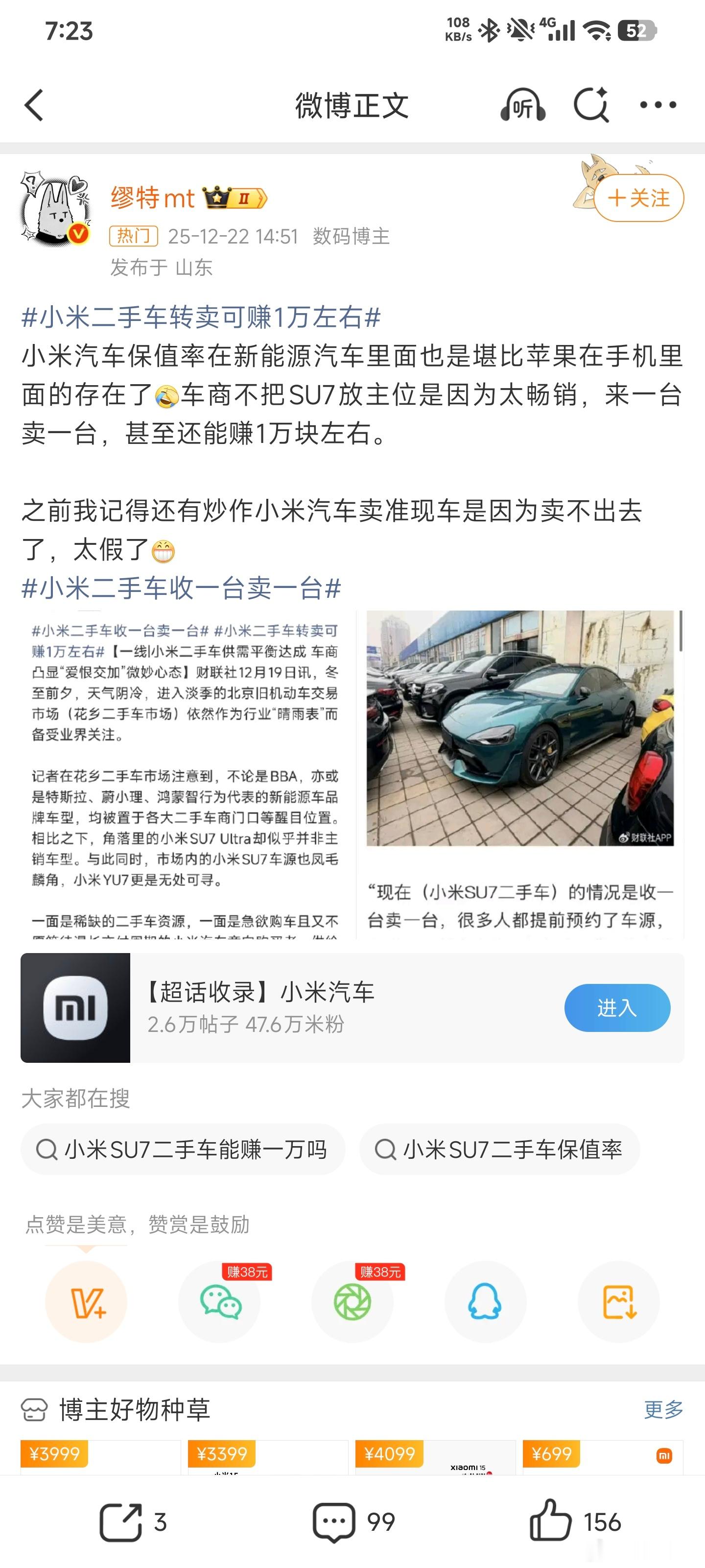 又开始完成主人的任务了,自己不看看二手市场的价格跌成什么了?这些尬吹内容看得我想笑,睁眼说瞎话可能比较重要吧。品牌祛魅正在发生,谁都逃不了!小米二手车收一台卖一台小米二手车转卖可赚1万左右