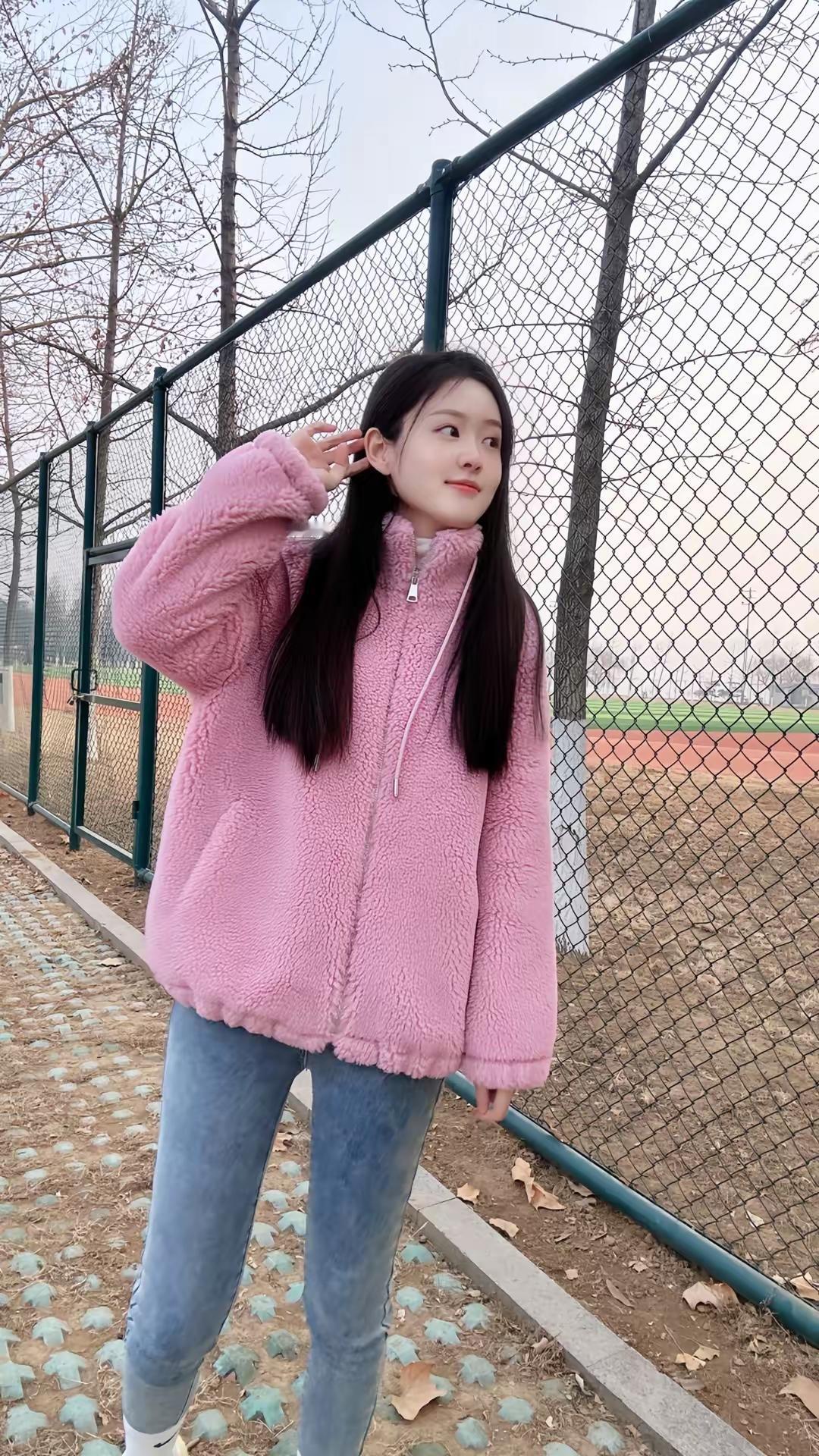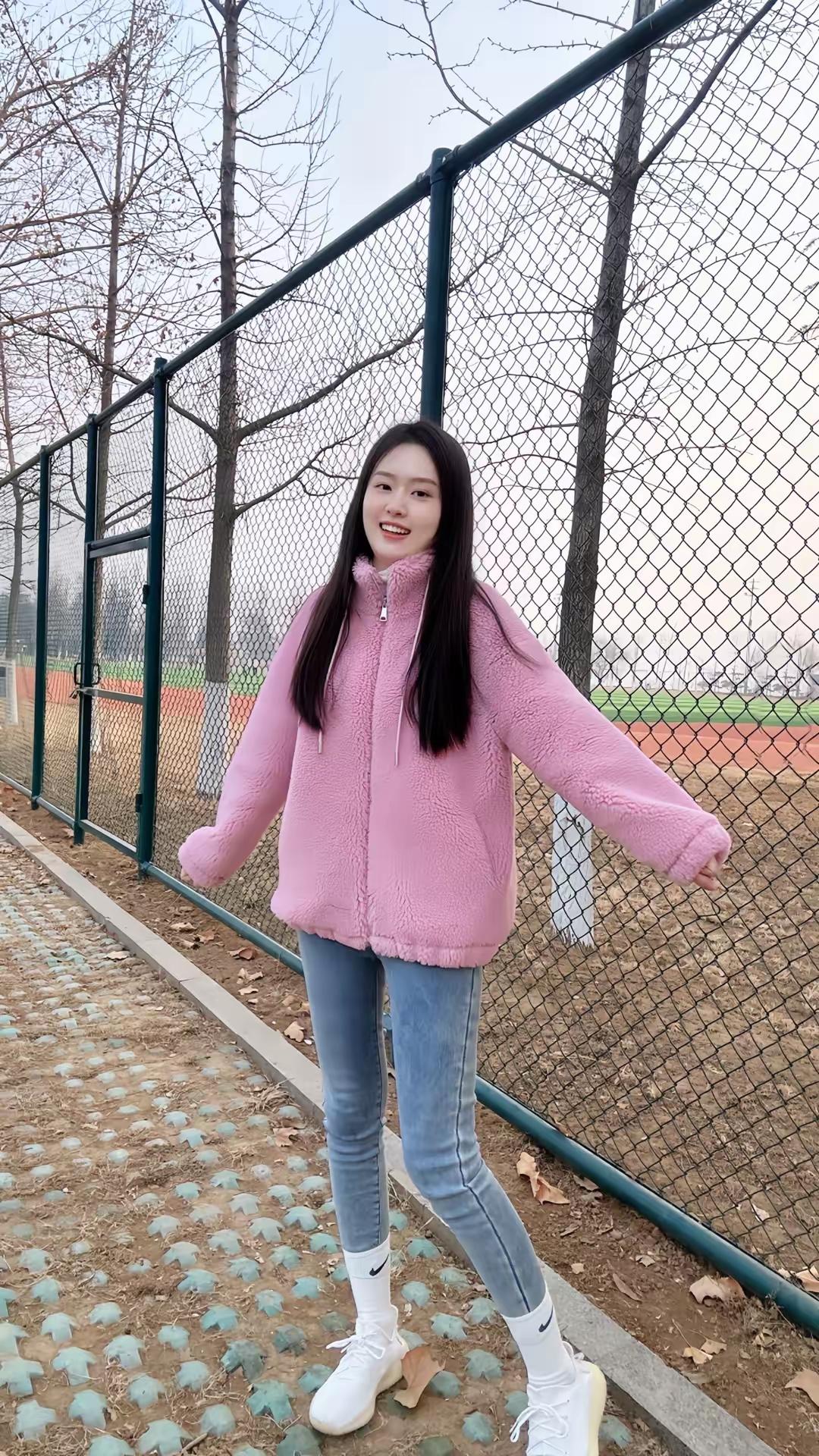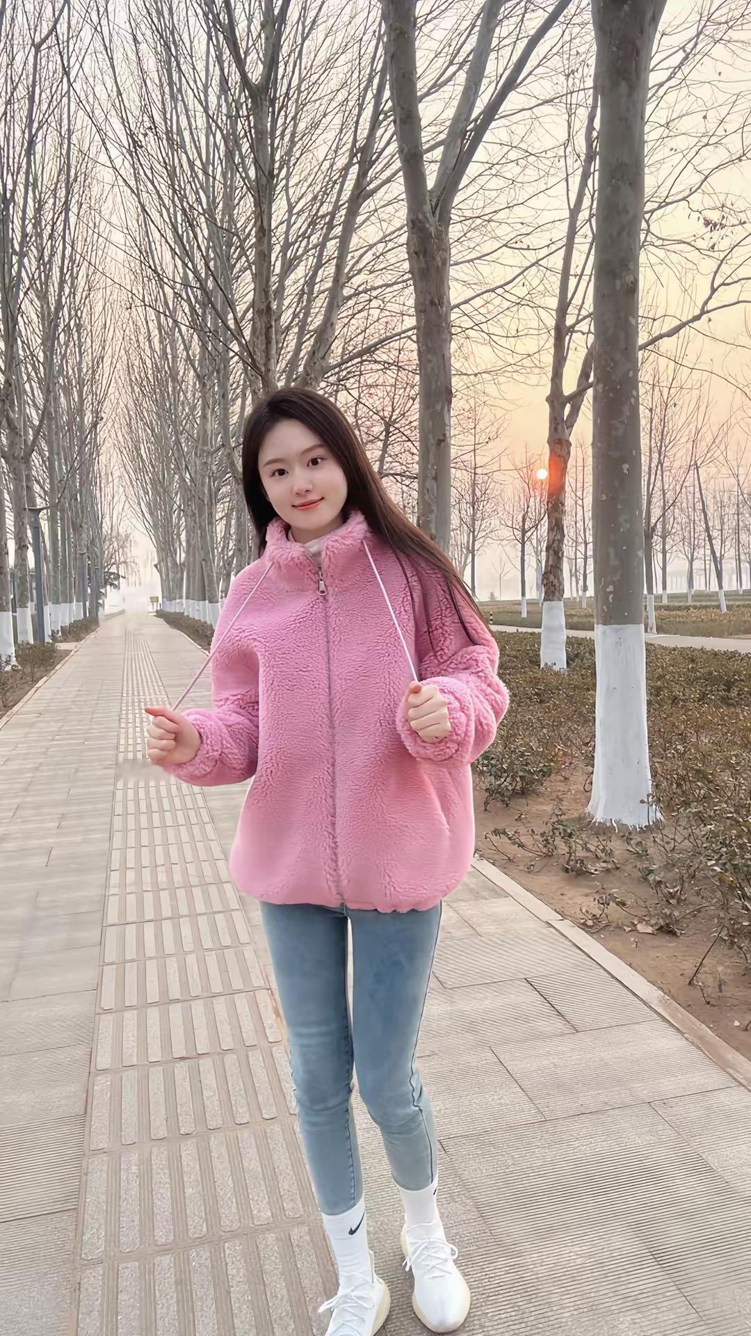粉衣少女立绿荫,笑语盈盈意自闲。