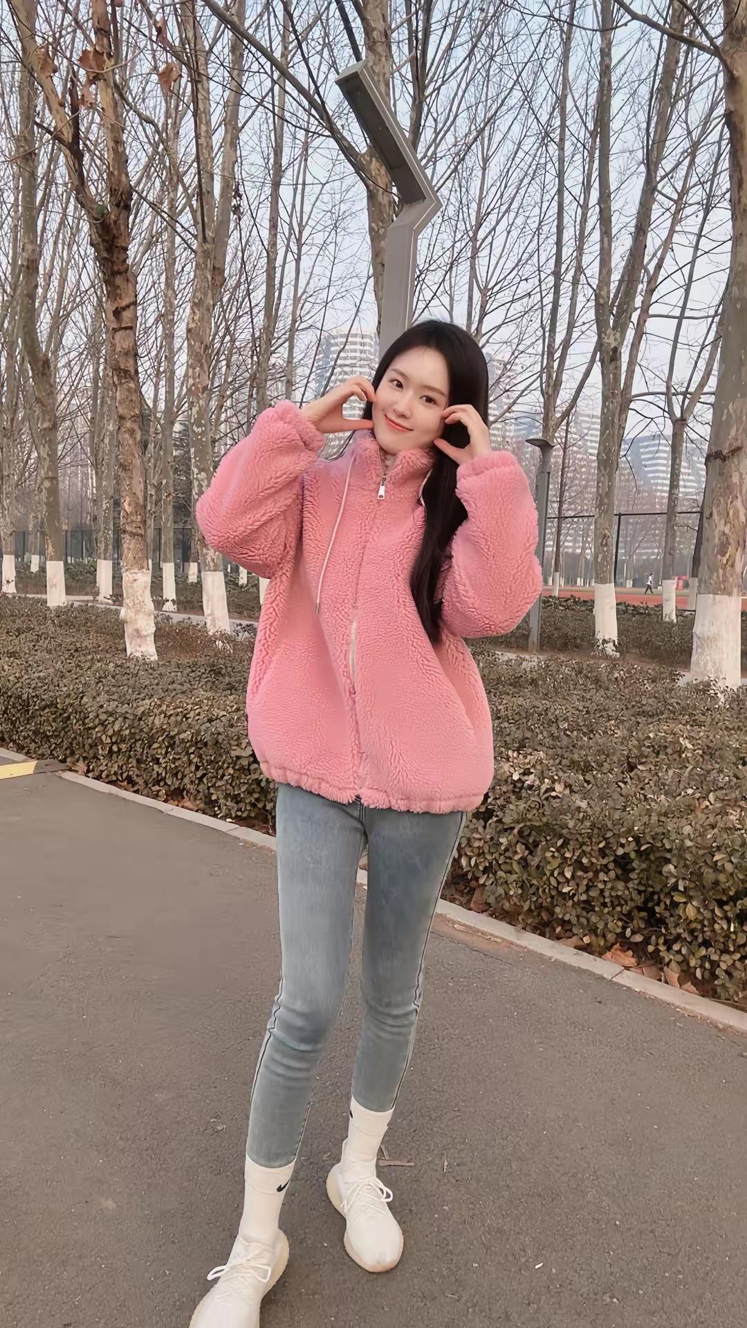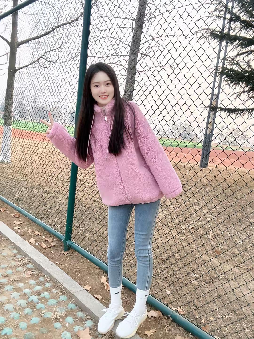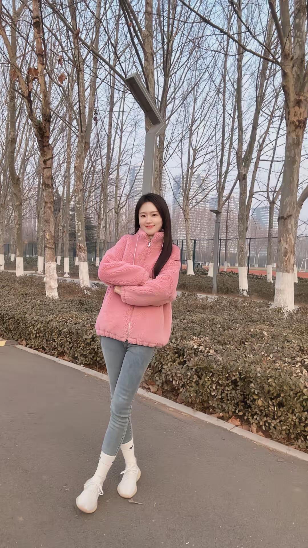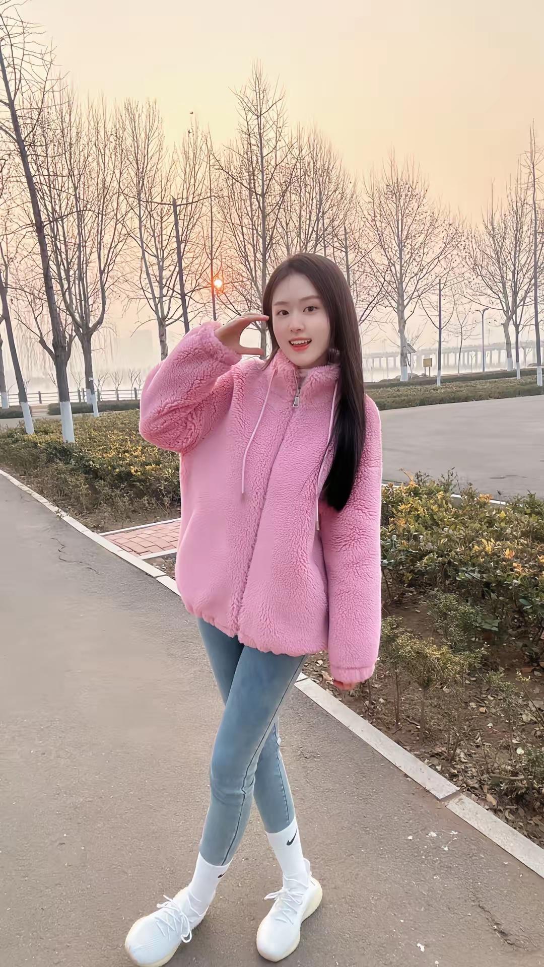 粉衣少女立绿荫,笑语盈盈意自闲。