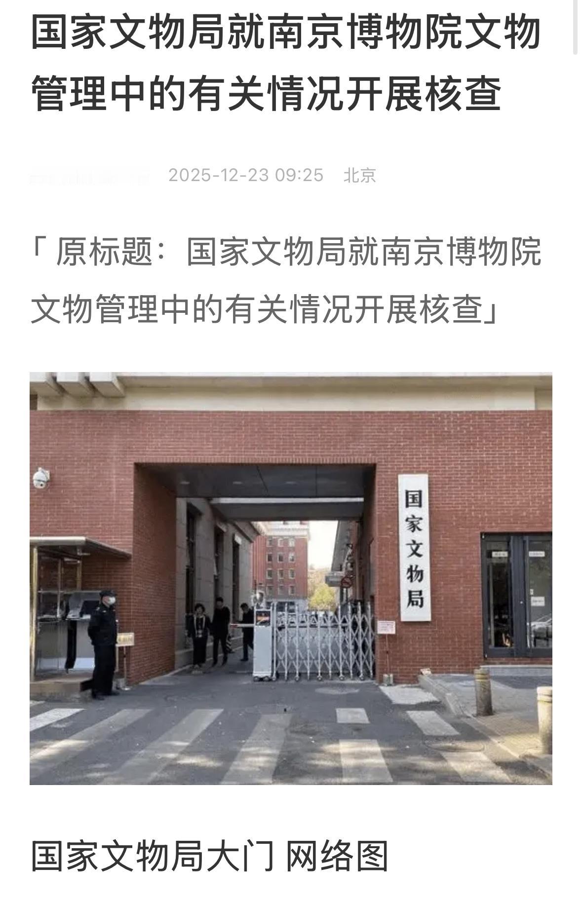 南京博物院事件,即将水落石出,央视记者从国家文物局获悉,国家文物局成立工作组,就南京博物院文物管理中的有关情况开展核查。由于涉及到省里的老同志,建议提级调查,文物局可能没有能力对涉及腐败、盗窃等违法违纪问题进行调查。