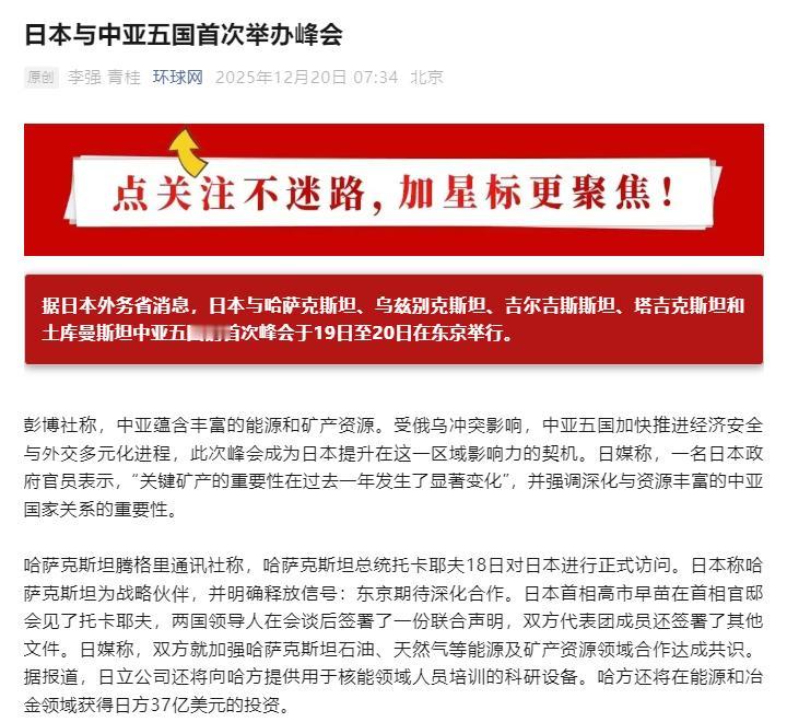 就在刚刚 12月22日,普京背手而立,与刚从日本赶来的哈萨克斯坦总统、吉尔吉斯斯坦总统聊得火热。而塔吉克斯坦总统、乌兹别克斯坦总统也已经赶到俄罗斯。也就是说,中亚5国领导人,已经有4个到达俄罗斯了。除了土库曼斯坦总统没到,其他4位总统都是从日本直接飞到俄罗斯的。 要搞懂这事儿的门道,得先明白这四位总统为啥会先去日本。就在12月19到20号,日本首次举办了和中亚五国的峰会,日本首相高市早苗特意把五国领导人请过去,核心目的很明确:盯着中亚的能源和关键矿产。 中亚可是个“资源宝库”,哈萨克斯坦有半导体需要的稀有金属,乌兹别克斯坦有铀和黄金,土库曼斯坦的天然气储量排世界第四,这些都是日本搞经济、稳供应链急需的东西。日本早在2004年就跟中亚建了对话机制,之前想办首脑会还因为地震预警取消了,这次总算办成,就是想趁着美俄都在拉拢中亚的档口,分一杯羹。 但谁也没料到,日本的峰会刚结束,四位总统连倒时差的功夫都没留,直接飞了俄罗斯见普京。这背后最核心的原因,还是俄罗斯在中亚的分量,至今没人能替代。 可能有人会说,现在美国也在使劲拉拢中亚啊?没错,今年11月初,美国刚在华盛顿开了“C5+1”峰会,就是美国加中亚五国,跟哈萨克斯坦签了170亿美元的协议,跟乌兹别克斯坦也谈了近350亿美元的采购计划,又是搞关键矿产对话,又是推进所谓的“和平与繁荣路线”,说白了就是想挤掉俄罗斯的空间,把中亚拉到自己这边。 面对美国的动作,俄罗斯早就开始布局了,这次四位总统主动上门,就是俄中亚关系的最好证明。10月份,俄罗斯刚在塔吉克斯坦开了第二届中亚-俄罗斯峰会,还通过了2025到2027年的共同行动计划,要深化经贸、能源、物流这些领域的合作。 11月底,俄罗斯主导的集安组织峰会又在吉尔吉斯斯坦开了,签了未来五年的军事合作规划,明确反对其他国家把军事设施往集安组织边境推,普京还专门去吉尔吉斯斯坦访问,加固了当地的坎特军事基地。 就连12月21号,也就是会面的前一天,普京还在圣彼得堡开了欧亚经济联盟的会议,强调要跟成员国深化合作,稳定欧亚地区的经济。 这些动作不是白做的,现在俄罗斯和中亚的贸易额摆在那,今年1到7月还涨了4%,总规模达到450亿美元,远超美国和中亚70亿美元的贸易额。 对中亚国家来说,俄罗斯不只是贸易伙伴,更是安全靠山,哈萨克斯坦、吉尔吉斯斯坦、塔吉克斯坦都是集安组织成员国,遇到安全问题得靠这个框架撑腰;经济上,俄罗斯的“北-南”“东-西”走廊能帮中亚打通物流瓶颈,能源合作更是刚需。 就像之前哈萨克斯坦总统刚从美国访问回来,转头就去俄罗斯签了13份合作文件,把两国关系升到全面战略伙伴联盟,这就是中亚国家的生存智慧:谁也不得罪,但核心利益不能丢。 再说说为啥土库曼斯坦总统没到。这跟它的定位有关,土库曼斯坦是永久中立国,虽然也参加了日本的峰会,但在俄美之间会更注意保持距离,不轻易站队。不过这并不影响整体格局,另外四位总统的态度已经很明确:就算跟日本、美国谈合作,也不能动摇跟俄罗斯的传统关系。 说到底,这波“日本开完会飞俄罗斯”的操作,本质上是中亚国家在大国博弈中找平衡的缩影。美国想拉中亚制衡俄罗斯,日本想抢资源,俄罗斯则在巩固自己的战略后院。而中亚国家心里门儿清,谁的合作能真正落地、谁能保障自己的安全,才是最关键的。 普京这次跟四位总统聊得火热,大概率还是围绕能源合作、区域安全、物流通道这些实打实的议题,毕竟在西方制裁的压力下,中亚已经成了俄罗斯绕开物流瓶颈、开展产业合作的重要平台。 接下来的趋势也很明显,美国已经计划2026年再开美中亚峰会,还想让国务卿访问中亚;俄罗斯则会继续通过集安组织、欧亚经济联盟这些平台绑定中亚。而中亚国家就会在这种博弈中,继续走“左右逢源”的路线,既拿美日的投资和订单,也靠俄罗斯保安全、稳经济。 这不是什么复杂的大道理,就是国与国之间最现实的利益考量,而12月22日这场跨越两国的会面,正好把这种考量摆到了明面上。