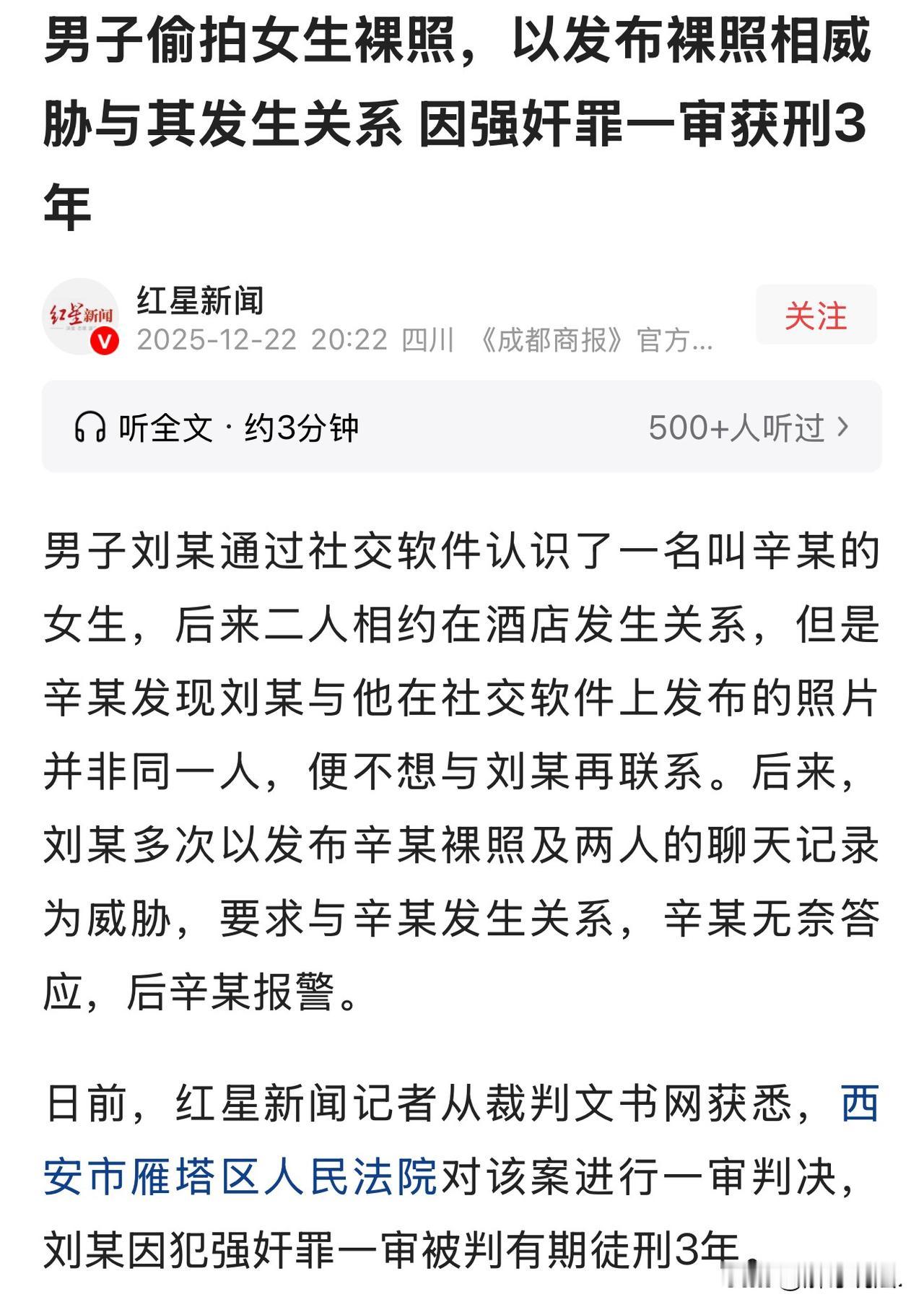 陕西西安,女大学生在交友软件上结识一男子,2人相谈甚欢。一个月后,约至酒店见面。谁知,女子发现对方不是照片里的人。可女子还是半推半就的与对方发生了关系。事后,女子后悔了,想与对方断绝关系。对方威胁她,要把聊天记录和女子照片发出去。女子担心事情曝光后,同学、家人该怎么看她,就再次与男子发生了关系。万万想不到,对方得寸进尺,继续威胁女子。女子不干了,果断报了警。 辛某是名大学生,课余时间里,她总爱刷一刷交友软件,打发无聊时间。 2024年6月的一天,一个头像帅气的男生闯进了她的视线。 这个叫刘某的男生,主页里的照片张张都透着阳光潇洒的劲儿,剑眉星目,穿搭也很有品味,一下子就戳中了辛某的心。 她鬼使神差地点开了对话框,主动打了声招呼,没想到两人竟然格外投缘。 从兴趣爱好聊到人生理想,从校园趣事聊到未来规划,仿佛有说不完的话。 隔着屏幕,辛某觉得自己遇到了灵魂契合的那个人,每天抱着手机等消息成了她最期待的事,心里的小鹿也跟着乱撞。 刘某的甜言蜜语更是像裹了蜜一样,把她哄得晕头转向,一来二去,两人的关系迅速升温,暧昧的情愫在屏幕两端疯长。 没过多久,两人就都按捺不住想见一面的冲动,一拍即合约定了在酒店见面。 赴约那天,辛某特意打扮了一番,心里既紧张又期待,满脑子都是照片里那个帅气的身影。可当她推开酒店房门,看到眼前的人时,心里的那点雀跃瞬间碎了一地。 眼前的刘某和照片上判若两人,相貌平平不说,气质也和照片里的潇洒帅气搭不上半点边,怎么看都不像是同一个人。 巨大的心理落差让辛某愣在原地,心里满是失望和别扭。 可事已至此,再加上刘某在一旁不停解释、软磨硬泡,稀里糊涂的她还是没能狠下心离开,最终和刘某发生了关系。 走出酒店的那一刻,辛某的心里只剩下懊悔和难堪。她觉得这段关系荒唐又可笑,恨不得马上把这一页翻过去。 回到学校后,她立刻下定决心,不再和刘某联系,删掉了聊天框里的记录,想着从此就当这场网恋从没发生过。 可辛某万万没想到,这只是她噩梦的开始。没过几天,沉寂的聊天框突然弹出了刘某的消息,语气强硬地要求她再出来见面,还指定了上次那家酒店。 辛某想都没想就拒绝了,可刘某接下来的话,却让她如坠冰窟。 刘某赤裸裸地威胁道:“你要是敢不出来,我就把咱们的聊天记录和你的照片都发到你们学校的论坛、贴吧里,让全校的人都看看你是什么样子,看你以后还怎么做人!” 直到这时,辛某才惊觉,不知道什么时候,刘某竟然偷偷拍下了她的隐私照片。 恐惧和无助瞬间席卷了她。她不敢想象,那些私密的东西一旦被曝光,自己在学校会面对怎样的指指点点,会承受多大的舆论压力。 她还只是个学生,根本扛不住这样的打击。在刘某的步步紧逼下,走投无路的辛某只能含泪妥协,再一次乖乖赴约。 这一次的见面,对辛某来说就是一场彻头彻尾的噩梦。 刘某不仅强迫她再次发生了关系,还趁她不注意,又偷偷拍了更多不堪入目的照片。 看着刘某那副得意的嘴脸,听着他变本加厉的威胁,要求她以后必须随叫随到,辛某的心里充满了屈辱和愤怒。 回到宿舍后,辛某躲在被子里哭了很久。她知道,一味的妥协只会让刘某更加得寸进尺,自己永远也逃不出这个魔爪。 思来想去,她终于鼓起勇气,拿起手机拨通了报警电话。 这场由网恋引发的悲剧,不仅让辛某的身心遭受重创,刘某的一系列行为更已触犯法律红线。 《民法典》第1032条规定,自然人享有隐私权,任何组织或者个人不得以刺探、侵扰、泄露、公开等方式侵害他人隐私权,隐私包括自然人的私密空间、私密活动、私密信息。 刘某在辛某不知情的情况下,偷偷拍摄其隐私照片,本身已构成对隐私权的侵犯;后续以公开隐私为威胁的行为,进一步加剧了对辛某私人生活安宁的侵扰,需承担停止侵害、赔礼道歉、赔偿精神损害等民事责任。 《治安管理处罚法》第42条规定:偷窥、偷拍、窃听、散布他人隐私的,处五日以下拘留或者五百元以下罚款;情节较重的,处五日以上十日以下拘留,可以并处五百元以下罚款。 刘某偷拍辛某隐私照片,并以散布为威胁,即便未实际公开,其偷拍和威胁行为已涉嫌违反该规定,可依法受到行政处罚;若其实际散布照片,还可能面临更严厉的法律追责。 《刑法》第136条规定,以暴力、胁迫或者其他手段强奸妇女的,构成强奸罪。 刘某以散布隐私照片、聊天记录为要挟,迫使辛某违背意愿再次与其发生性关系,属于典型的“胁迫”手段,完全符合强奸罪的构成要件。 即便两人曾有过自愿发生关系的经历,也不影响此次胁迫行为构成犯罪,其本质是对辛某性自主权的严重侵犯。 最终,法院判决刘某犯强奸罪,判处其有期徒刑3年。