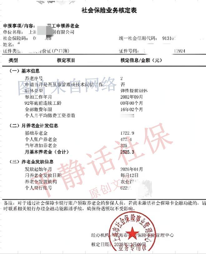 上海养老金! 女性,25年12月退休,从2026年开启人生“白领”生活。缴费16年2个月,个账9.31万,指数0.7142 基础养老金1722.9元 个账养老金477.4元 增发养老金325元 合计2525.30元 平均工龄单价156元/年 这样的养老金羡煞多少缴费十五六年的人群。 同样是缴费十五六年,绝大多数参保人的养老金集中在1300-1800元区间,能突破 2000 元的已是凤毛麟角。 而在上海,累计缴费 16年的参保人,退休后竟能领取2500元以上的养老金,这样的待遇水平,远超同年限参保人。 从表格可以看出,参保人退休时是企业在职职工状态,因此推测是50岁退休。 开始参保时间为2002年9月,但只陆续缴纳了16年社保,最终能拿到2500以上,得益于几点有利因素: 1、计发基数高,上海计发基数全国第一12434元。 2、缴费指数计算方式。 3、增发养老金