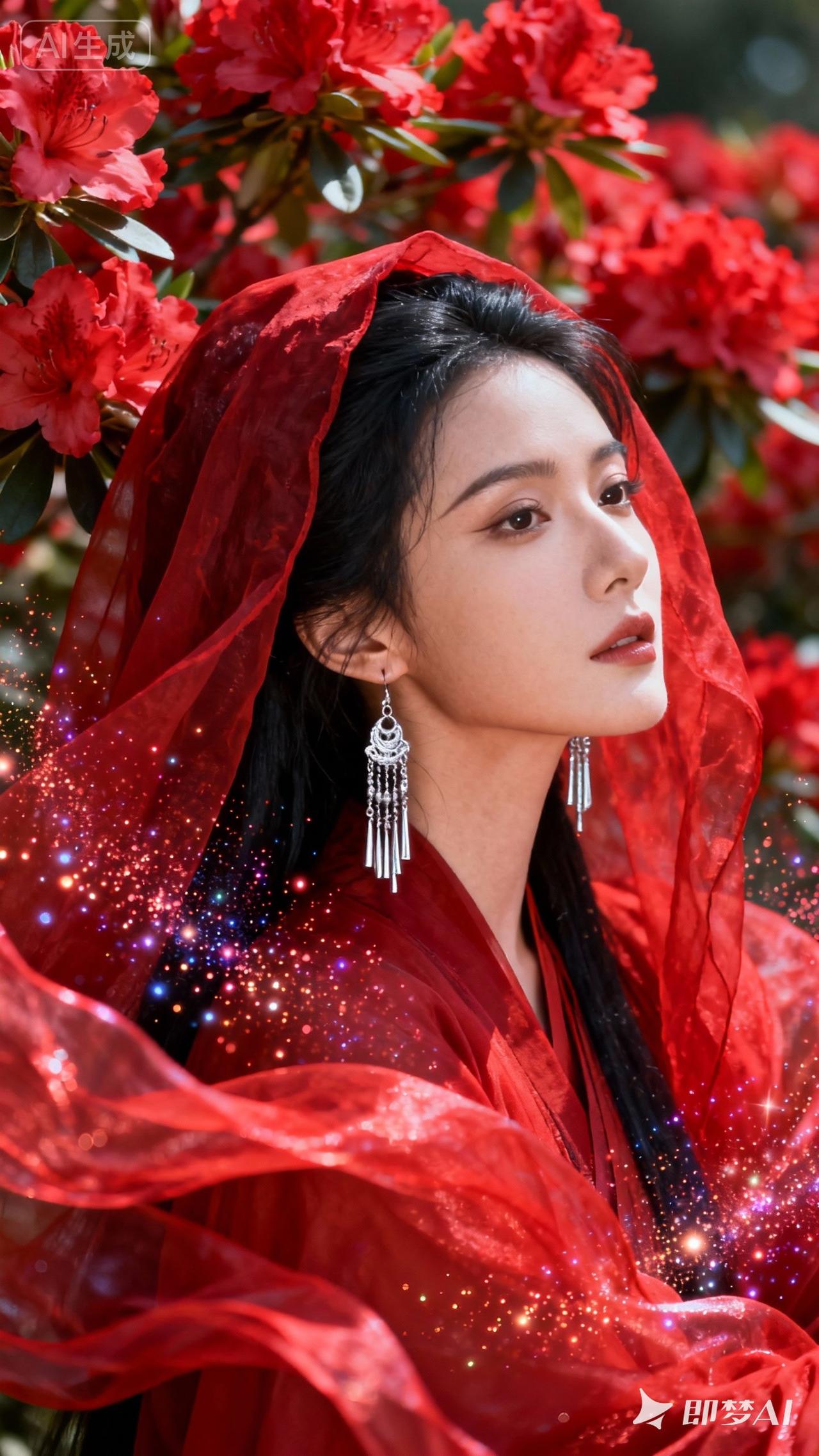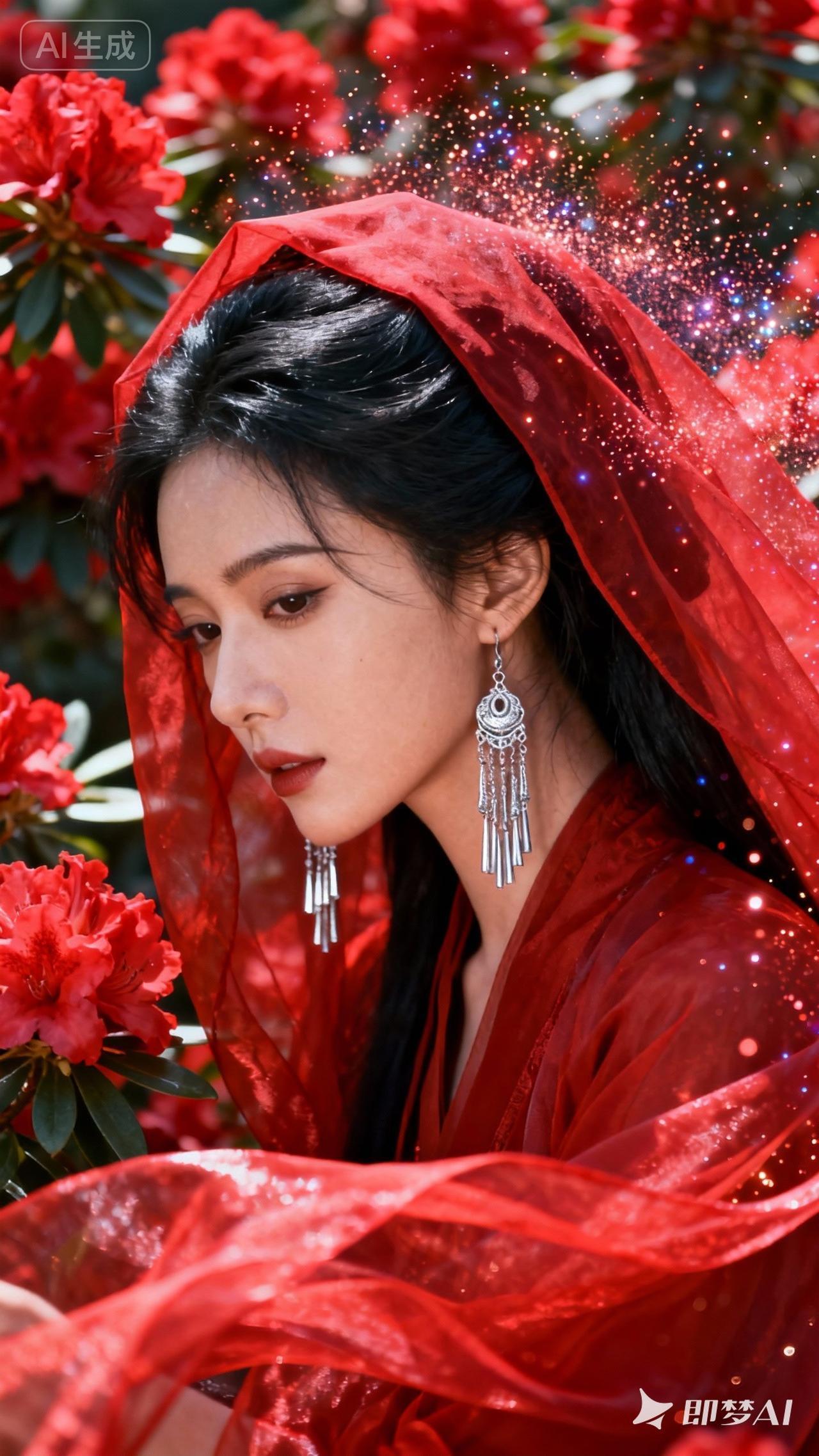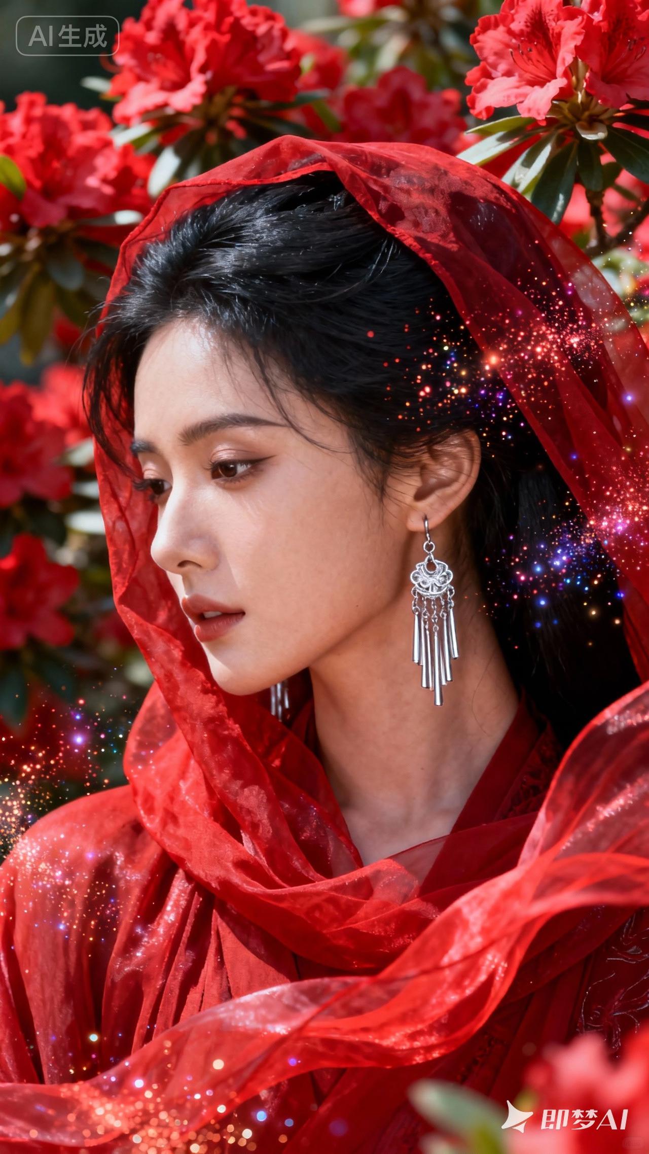绿衣美人倚花丛,笑语盈盈似画卷。