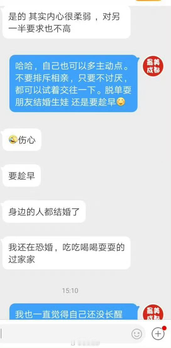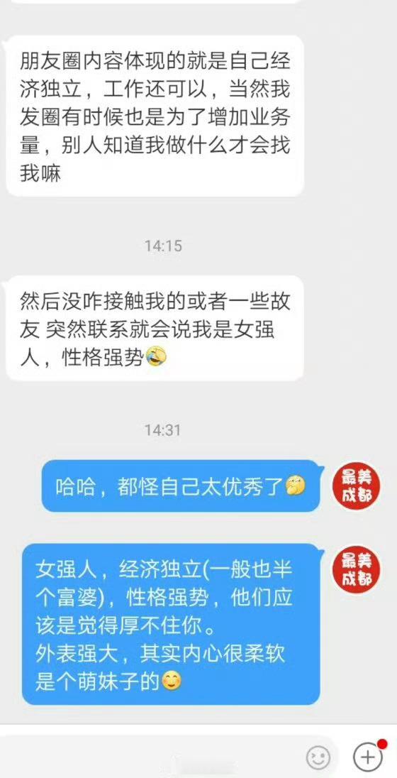【男生说我太强势不好相处!其实我内心很柔弱 要求也不高】小美,这社会对女性太不友好了:经济独立多挣点就说你强势,你不努力吧又被嫌弃说依靠男人!其实我内心很柔弱,对男生要求也不高,只是有点恐婚。身边的朋友都结婚了,而我每天吃吃喝喝耍耍的过家家,感觉自己还没长醒… 羡慕已婚男结婚后的状态你觉得自己强势吗?现在经济独立么?女子恋爱中被要求攒够4万再结婚 成都