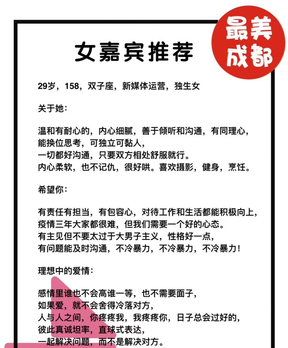 成都征婚【第7512号】96年女生,身高158,新媒体运营,独生女;温柔细腻,不记仇很好哄,可粘人可独立。希望男生性格好,有责任心有担当,不大男子主义冷暴力…详情戳图↓特约嘉宾——有意者请私信小美,投稿/加群/周末相亲会/小红娘1V1牵线 请私信! 成都征婚成都相亲