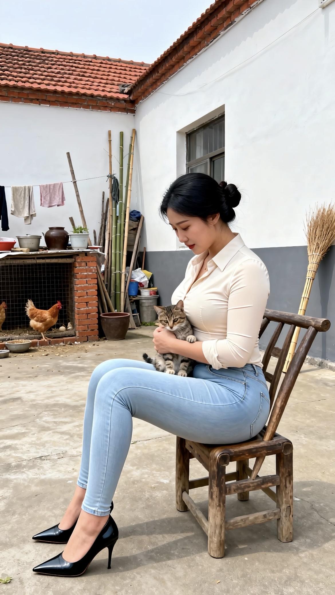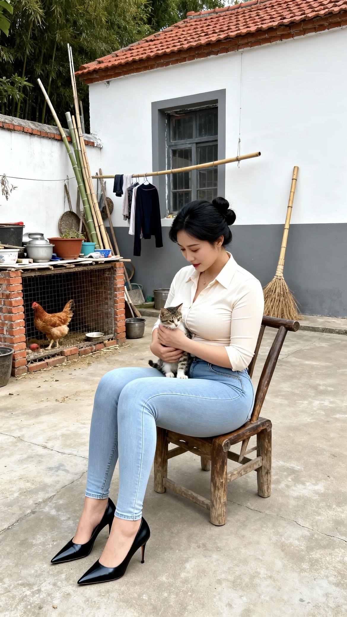 灰白的屋墙凝着乡居的质朴,红瓦的檐角勾着浅淡的天光,砖垒的鸡笼里立着鲜活的土鸡,竹枝与扫帚倚在墙边,衬出小院的日常琐碎,老旧的木椅刻着岁月的纹路,怀抱着的花猫添了几分软萌的生机,温热的触感像是与生活的温柔相拥,晾衣杆上的衣物漾着人间烟火的软糯,陶制盆器凝着岁月的温润,每一个相拥的姿态都融进乡院的烟火里,风掠过院中的竹林捎来清浅的香,平凡的瞬间便在这方小院的日常中,漾出淡淡的诗意与人间相伴的温情美好。农村