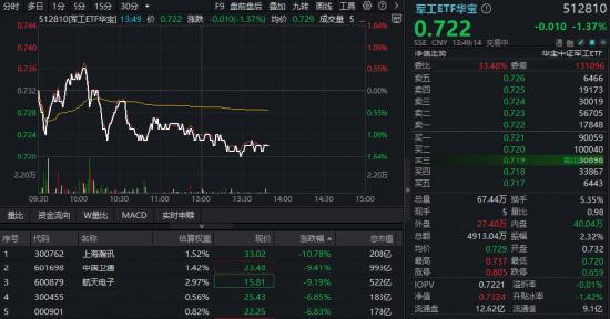 ETF方面,高人气军工ETF华宝(512810)被动跟踪中证军工指数,午后一度跌至1.64%,止步四连阳,实时成交超4900万元。