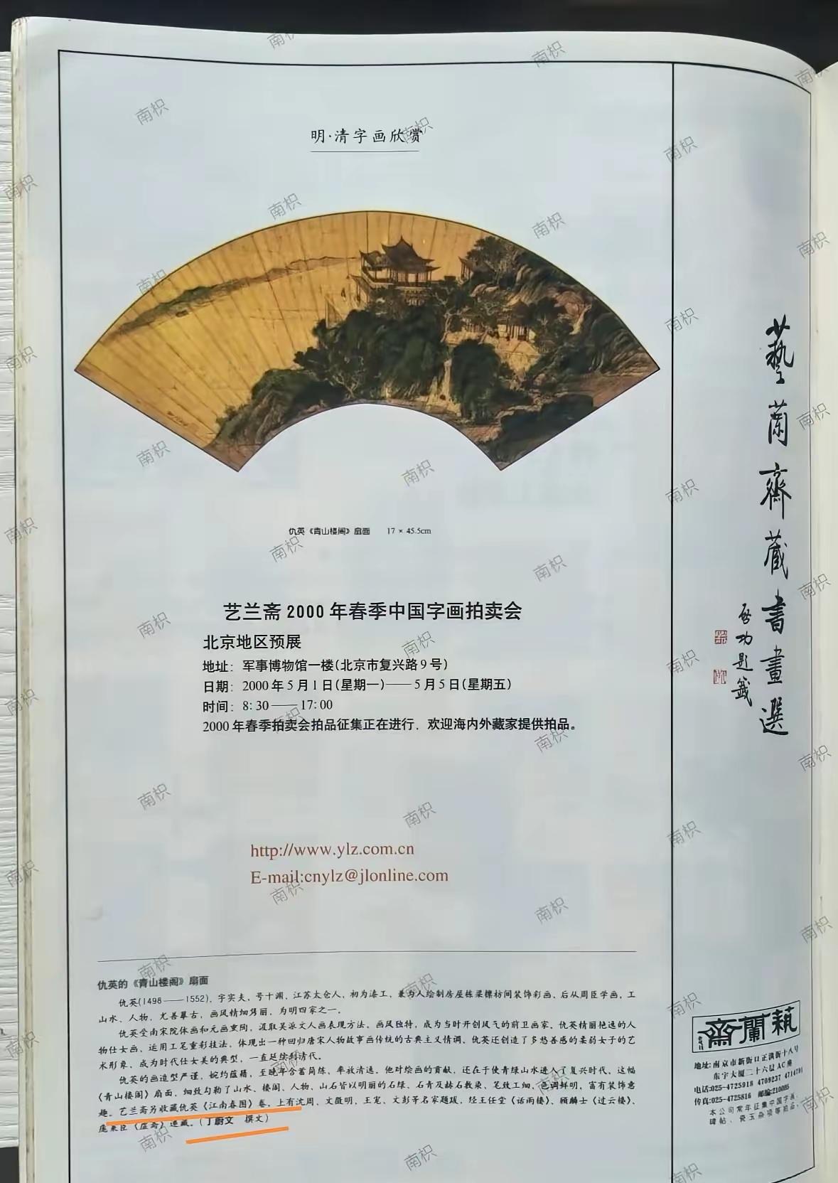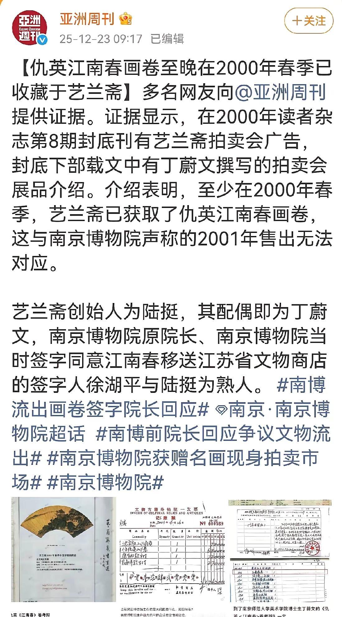《亚洲周刊》再添新证据, 南博之前的声明又被打脸, 原来早在2000年的时候,仇英的《江南春》画卷就已经在艺兰斋了。 近日,有网友向《亚洲周刊》提供证据,2000年时,艺兰斋举办了一个春季字画拍卖会,在刊登这个拍卖会广告的底部封底,有展品介绍,上面赫然写着“艺兰斋另收藏仇英《江南春图》卷”。 这就有挺矛盾了,艺兰斋的主人是陆挺,陆挺的老婆是丁蔚文,2000年那个拍卖会广告底部的展品撰文就是丁蔚文写的。 这则新曝光的证据,让南京博物院“江南春”风波的疑点更添一层。首先要理清的是时间线的关键矛盾:2000年的拍卖会广告并非随意刊登的普通信息,而是艺兰斋面向公众发布的商业宣传,封底的藏品介绍直接标注“收藏仇英《江南春图》卷”,撰文者还是馆主陆挺的妻子丁蔚文——作为藏品相关的核心知情人,她的表述很难用“笔误”或“误解”来解释。 更值得琢磨的是这则证据的可信度。拍卖会广告属于公开传播的商业资料,当年刊登的载体必然经过审核,其记载的藏品信息直接关系到艺兰斋的行业信誉,不可能凭空捏造。换句话说,2000年时艺兰斋持有这幅名画,是其主动向外界传递的信息,而非多年后争议爆发时的“事后补述”,这种原始资料的说服力,远非口头声明所能比拟。 回顾此前的风波,南京博物院曾就《江南春》的收藏来源、真伪鉴定等问题发布声明,而这则2000年的广告,相当于从时间维度上对部分声明内容提出了直接质疑。公众之所以对此事持续关注,不仅因为仇英作为明代“吴门四家”之一,其作品本身具有极高的艺术与历史价值——《江南春》作为描绘江南春日盛景的传世名作,流传脉络的清晰与否,本身就是文物保护与研究的重要组成部分。 更深层的矛盾在于,文物的收藏传承本应是有据可查的“透明账”。艺兰斋作为业内知名的收藏机构,其藏品流转记录本应具备严肃性;而南京博物院作为国家级博物馆,对馆藏文物的来源追溯与信息披露,更是承载着公众的信任。如今2000年的原始广告与后续声明出现分歧,难免让人们对这幅名画的真实流转路径产生疑问:从2000年艺兰斋的“收藏声明”,到后来进入南博馆藏,中间究竟经历了怎样的过程?相关的记录为何会出现矛盾? 文物是历史的见证者,其背后的流转故事本应是一段段鲜活的文化记忆,而非充满疑点的争议迷局。无论是民间收藏机构还是公立博物馆,对文物信息的严谨性都是不可逾越的底线——这不仅关乎一件藏品的价值认定,更关乎文化传承的可信度。此次《亚洲周刊》曝光的新证据,或许能成为解开谜团的一把钥匙,让公众离真相更近一步。 各位读者你们怎么看?欢迎在评论区讨论。南博 文物 南京博物院