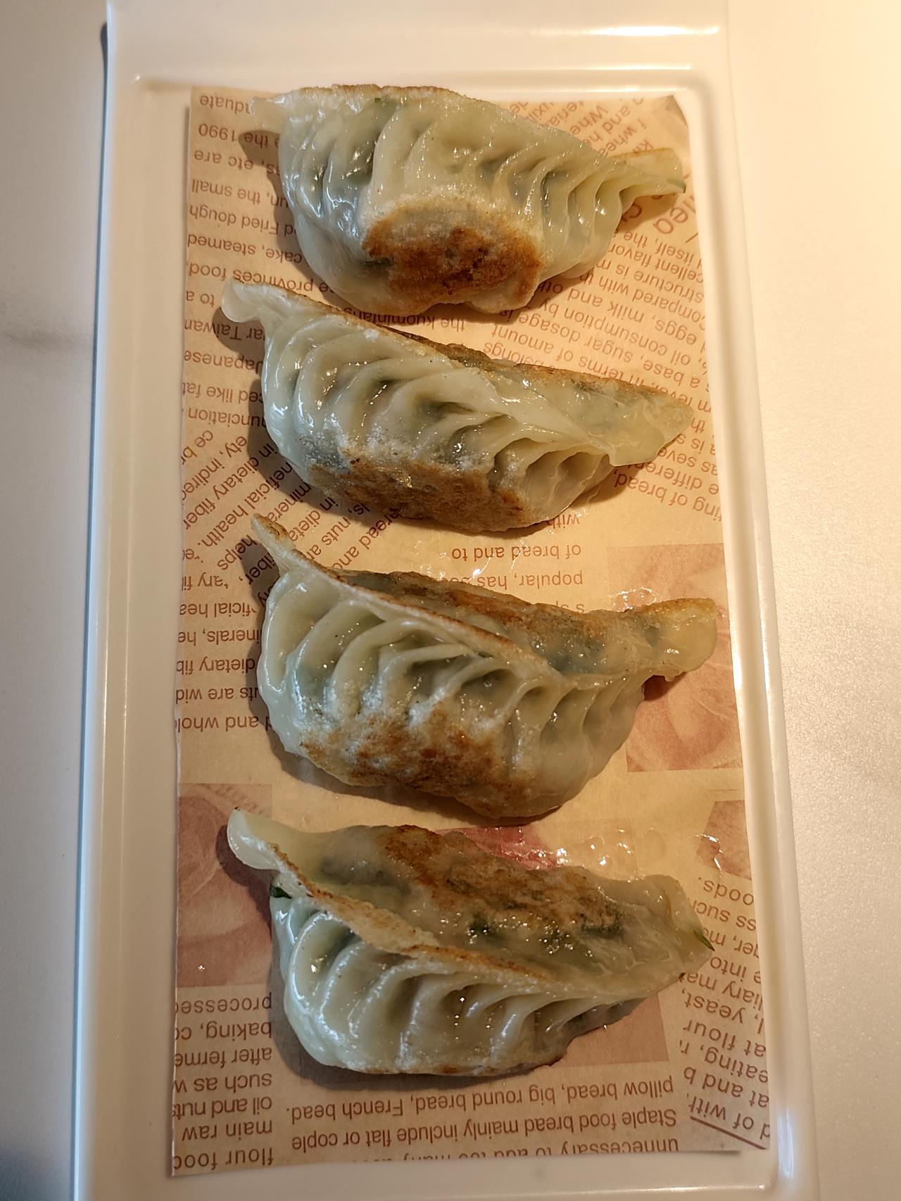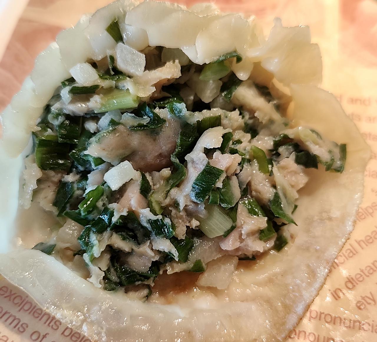 这几天总是看到有人写南方人冬至吃汤圆,北方人吃饺子的微头条,还有人问南方人一次可以吃多少只饺子?我今天中午去黄埔区的茶楼饮茶,特意点了一碟4只煎饺子,一碟4片的煎咸肉粽,一共消费了36元。看看我把饺子皮扒开,里面有韭菜和猪肉碎,一只的饺子馅料有这么多,我一个中老年人吃四只饺子都够了,还有煎的咸肉粽都吃不了,打包带走了。如果是一个中年男人,干体力活的工人,估计就可以吃三碟这么大的饺子吧?再加上一碟咸肉粽应该都够饱了吧?