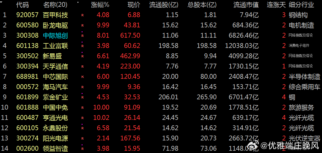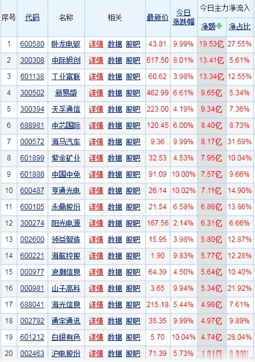 【财富晚茶】潜龙浮出水面:12.22主力资金:净流入前20股票导语:作者系《网易号》优质财经领域创作者。曾经原创作者和知名网易号旅游领域创作者。大跨度行业等的写作,颇受网友喜爱。作品发表于2025.12.22.12:18 优雅端庄晚风。【内容概述】今日股市收评评:主题是:【财富晚茶】潜龙浮出水面:12.22主力资金:净流入前20股票。主旋律:12.22主力资金:净流入前20股票:政策提振时代背景。一、视野最新:主力资金:前20强股票主旋律:最强股票:2025.12.22主力资金前20股票二、视野背景:特点逻辑:前20强股票主旋律:净流入股:潜伏特点核心逻辑复盘潜龙:浮出水面:12月22日:资金净流入的股票:主要集中:科技自主可控、消费回暖、资源重估三大主线。核心逻辑:政策红利、资金宽松、产业拐点等三重共振。具体透析如下:1、科技自主:可控板块第一、今日信息:国资委《规划建议》明确加强原始创新及关键核心技术攻关。信息耕耘:利好量子科技、6G、半导体等硬科技领域。第二、扩散外延:《规划建议》重仓股上周盘面:北向资金:周五流入31亿。流入标的:分别是:国家队长期持仓AI、半导体、机器人等硬科技领域。例如:华工科技、沪电股份等。第三、估值特点:《规划建议》受益股估值特点:资金从高位题材(如AI硬件)向低位补涨股切换。分别是:商业航天、无人驾驶等赛道崛起。与此同时:地方政府密集加码商业航天布局。2、消费回暖:试点受益第一、今日信息:商务部《50城试点》观商务部:“50城消费新业态试点”:是中央财办强调:“扩大内需为明年首要任务”的落地信号。市场必然:叠加年底节日消费旺季。“犒赏经济”:本质是政策托底+消费回暖的双向奔赴。第二、估值特点:《50城试点》受益板预热特点:消费(零售、乳业)、商业航天、无人驾驶等低位板块近期表现活跃,资金从高位题材向低位补涨股切换。第三、资源重估:《50城试点》机构者核心逻辑:高股息板块防御价值凸显,年底资金季节性流入(保险、外资)。金属板块已至顶部区间建议离场,其余轮动板块均按快进快出套利对待。第三、估值特点:《50城试点》受益股估值特点:资源与高股息板块:例如招商银行、紫金矿业等配置价值提升,适合年底避险需求。3、今日脉冲:操作建议第一、稳健配置:《50城试点》低估股稳健配置:核心价值(70%):高股息蓝筹:例如招商银行、中国太保+消费龙头:例如美的集团、贵州茅台。航天卫星(30%)低估值科技:例如海光信息、新易盛+资源股:例如紫金矿业。第二、稳健配置:《50城试点》独特股平衡配置:成长独特(50%):半导体:例如北方华创+AI应用:例如中际旭创+创新药。价值标的:(30%)家电:例如美的集团+食品饮料:例如西麦股份。防御品种(20%):银行范畴:例如招商银行+贵金属:例如紫金矿业。第二、进取配置:《50城试点》可控股进取配置:主线(60%)科技自主可控(立讯精密、海光信息)+消费电子,弹性(40%)新能源(鹏辉能源)+军工+AI应用。4、不得不防:风险预警市场仍偏:谨慎乏力:主力资金净流出居多,仅2个交易日小幅流入。量能缩量:创业板指:单周成交额从2万亿,降至2.32万资金观望浓。存量博弈:特征明显:外部环境不确仍存,美联储议息结果未明。全球流动:收紧预期:仍存压制。5、总而言之:补涨股主第一、今日资金:《50城试点》股短暂今日资金:净流入的股票:以政策利好板块及低位补涨股为主,结构性机会显著。但是必须:警惕今日波澜壮阔,明天突然熄火市场波动风险。三、猜忌股票:资金流入:前20强股票2025年12月22日资金净流入的股票有哪些?答案回答:股票主要:集中在科技、消费和资源板块重点如下:1、深市A股:资金前十中际旭创:净流入13.41亿元,光模块龙头,受益于AI算力需求增长。新易盛:净流入9.65亿元,光模块核心供应商,与中际旭创形成双龙头格局。天孚通信:净流入9.34亿元,光器件领先企业,受益于数据中心建设加速。海马汽车:净流入8.17亿元,新能源汽车概念股,政策利好推动资金流入。阳光电源:净流入6.31亿元,光伏逆变器龙头,受益于全球能源转型。领益智造:净流入5.8亿元,消费电子精密制造龙头,苹果产业链核心供应商。浪潮信息:净流入5.64亿元,服务器龙头,受益于AI算力需求爆发。山子高科:净流入5.34亿元,汽车零部件企业,龙虎榜显示机构抢筹6.88亿元。通宇通讯:净流入4.97亿元,通信设备供应商,受益于5G建设推进。沪电股份:净流入4.64亿元,PCB龙头,受益于AI服务器需求增长。2、沪市A股:资金前十卧龙电驱:净流入19.53亿元,电机龙头,受益于新能源汽车和工业自动化需求增长。工业富联:净流入13.34亿元,电子制造服务龙头,AI服务器核心供应商。中芯国际:净流入8.4亿元,半导体制造龙头,受益于国产替代加速。紫金矿业:净流入7.95亿元,黄金龙头,受益于金价上涨和资源重估。中国中免:净流入7.57亿元,免税龙头,受益于消费回暖和政策支持。亨通光电:净流入7.11亿元,光纤光缆龙头,受益于5G建设推进。永鼎股份:净流入6.88亿元,光通信企业,受益于数据中心建设加速。海航控股:净流入5.77亿元,航空运输企业,受益于出行需求恢复。海光信息:净流入4.98亿元,国产CPU龙头,受益于信创推进。白银有色:净流入4.74亿元,有色金属企业,受益于金属价格上涨。3、其他资金:流入个股云南锗业:净流入2.25亿元,锗资源龙头,受益于半导体材料需求增长。上海港湾:净流入2.23亿元,基建企业,受益于