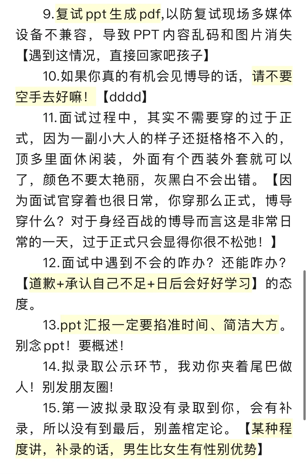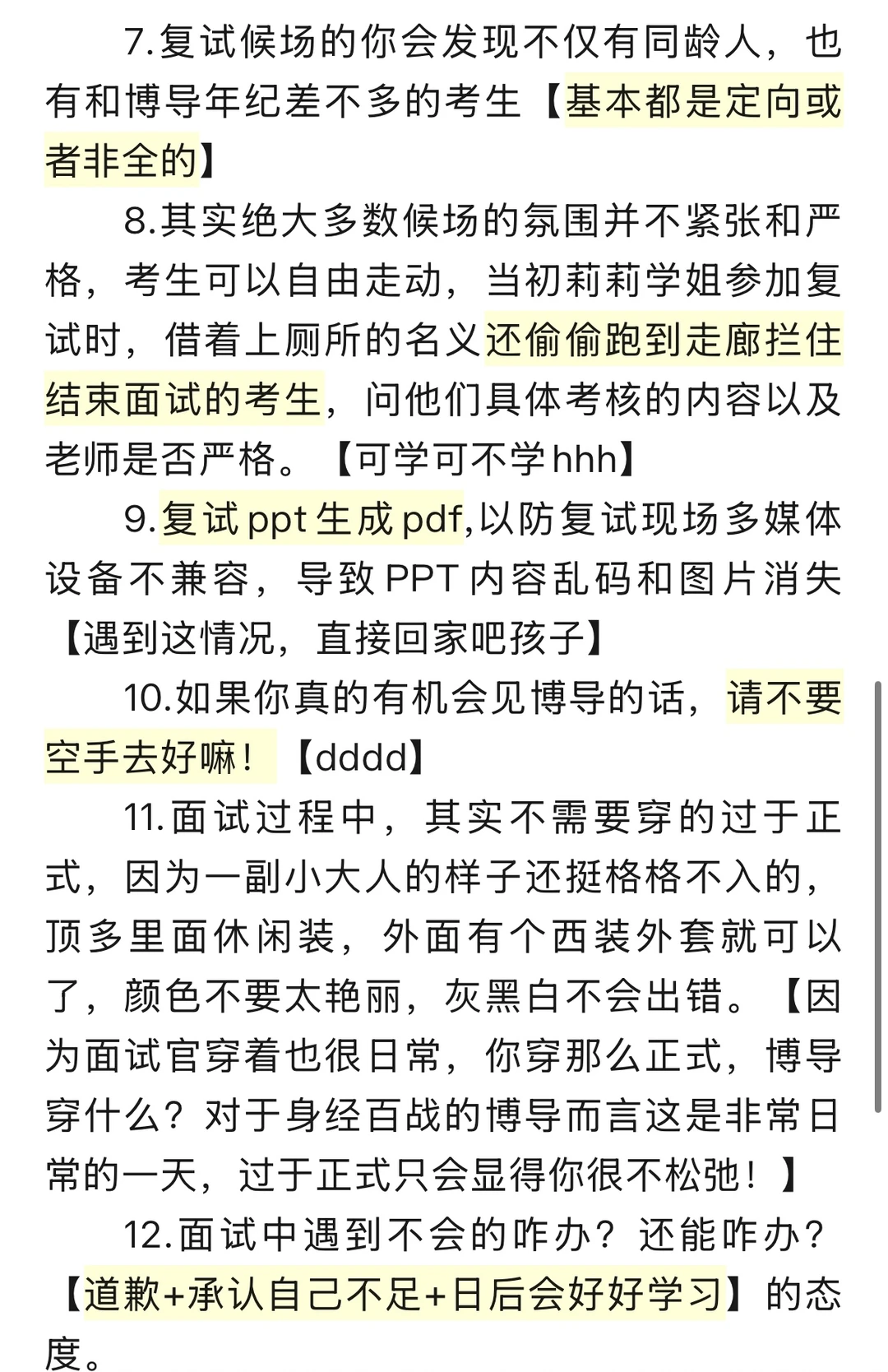 一些缓解焦虑的小TIPS!1.英文自我介绍一定要滚瓜烂熟,因为紧张状态下,你的记忆力会降低百分之40%,只有形成肌肉记忆,才能无脑背出来。2.专业课大多数采用现场选号码抽题的形式,建议你考前烧高香希望自己抽到刚好自己会背的题目。3.复试前后,见不见博导的效果天差地别。【一定要见!】4.遇到不会的,可以向面试官争取30-60秒的思考时间【因为紧张状态下,更容易答错】5.一般面试成员专家是5个人以上【一个组长、一个考核英语的老师、2-3个本学院的老师,一个秘书记录、偶尔情况下博导也会是面试官】6.我能说面试官他们都有劳务费嘛,一次大概300左右,秘书都是硕士博士助教学姐学长,他们没有劳务费,只有志愿时长【因为莉莉学姐就当过秘书啊hhhh 学院还会送给我们一份中午食堂的饭票. md都是牛马】7.复试候场的你会发现不仅有同龄人,也有和博导年纪差不多的考生【基本都是定向或者非全的】8.其实绝大多数候场的氛围并不紧张和严格,考生可以自由走动,当初莉莉学姐参加复试时,借着上厕所的名义还偷偷跑到走廊拦住结束面试的考生,问他们具体考核的内容以及老师是否严格。【可学可不学hhh】9.复试ppt生成pdf,以防复试现场多媒体设备不兼容,导致PPT内容乱码和图片消失【遇到这情况,直接回家吧孩子】10.如果你真的有机会见博导的话,请不要空手去好嘛!【dddd】11.面试过程中,其实不需要穿的过于正式,因为一副小大人的样子还挺格格不入的,顶多里面休闲装,外面有个西装外套就可以了,颜色不要太艳丽,灰黑白不会出错。【因为面试官穿着也很日常,你穿那么正式,博导穿什么?对于身经百战的博导而言这是非常日常的一天,过于正式只会显得你很不松弛!】12.面试中遇到不会的咋办?还能咋办?【道歉+承认自己不足+日后会好好学习】的态度。13.ppt汇报一定要掐准时间、简洁大方。别念ppt!要概述!14.拟录取公示环节,我劝你夹着尾巴做人!别发朋友圈!15.第一波拟录取没有录取到你,会有补录,所以没有到最后,别盖棺定论。【某种程度讲,补录的话,男生比女生有性别优势】