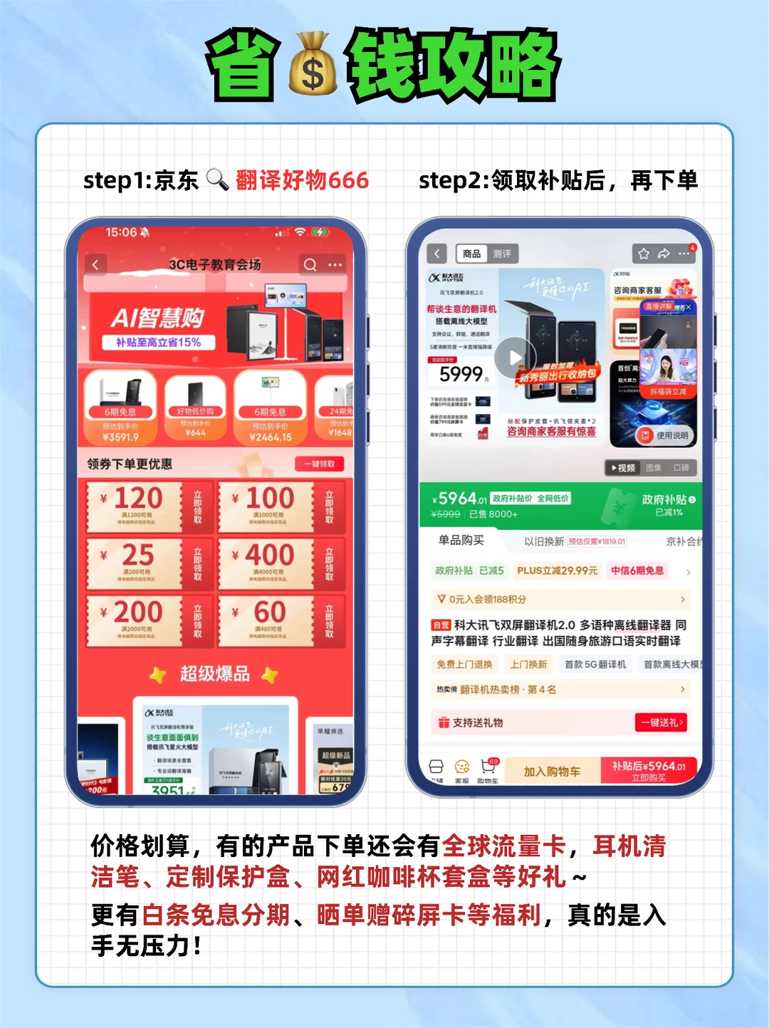 宝子们如果最近打算入手买一台翻译机,可以上京东购买!不仅价格划算,有的产品下单还会有全球流量卡,耳机清洁笔、定制保护盒、网红咖啡杯套盒等好礼~更有白条免息分期、晒单赠碎屏卡等福利,真的是入手无压力!
