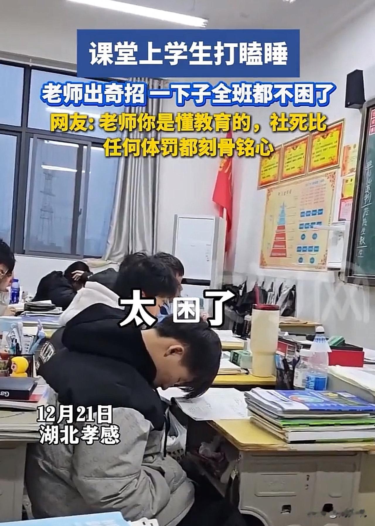 #学生上课打瞌睡 老师出奇招#“笑哭!”湖北孝感,一位男学生在课堂上打瞌睡,没想到这位老师的一番操作引发全网称赞。这位老师既没有责骂这位打瞌睡的学生,而且让他站起来坐到自己腿上来。结果出奇的好,一下子全班都不困了。 视频曝光后,不少网友纷纷表示:“老师你是懂教育的,社死比任何体罚都刻苦铭心。” 还有网友称赞:“这种方式既没体罚,又让孩子记住了教训,比吼一顿有效多了。” 在周少看来,这位老师的做法,至少有三点值得学习。不用羞辱,用“适度社死”提醒学生,既达到效果,又不伤害自尊。 而且,抓住了学生的心理,比起批评,他们更怕在同学面前丢脸。更知道使用幽默化解尴尬,让学生在笑声中意识到问题,而不是在恐惧中记仇。这番操作,确实让人不得不佩服和称赞。 总而言之,教育不是简单的“管住”,而是在尊重的前提下,让孩子学会自律。这位老师,是真的懂学生,也懂教育。#长沙新朋友# #寻美三湘#