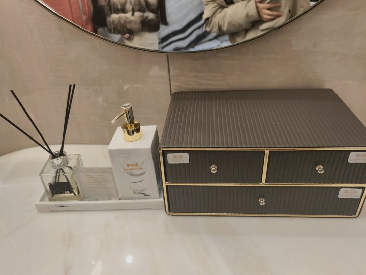 设备更是“顶配”:戴森洗烘套装、德国唯宝台盆、瑞士杜拉维特马桶,随便一件都是卫浴界的“奢侈品”;梳妆区除了护手霜、漱口水,还贴心放了发绳、卸妆棉,细节拉满。