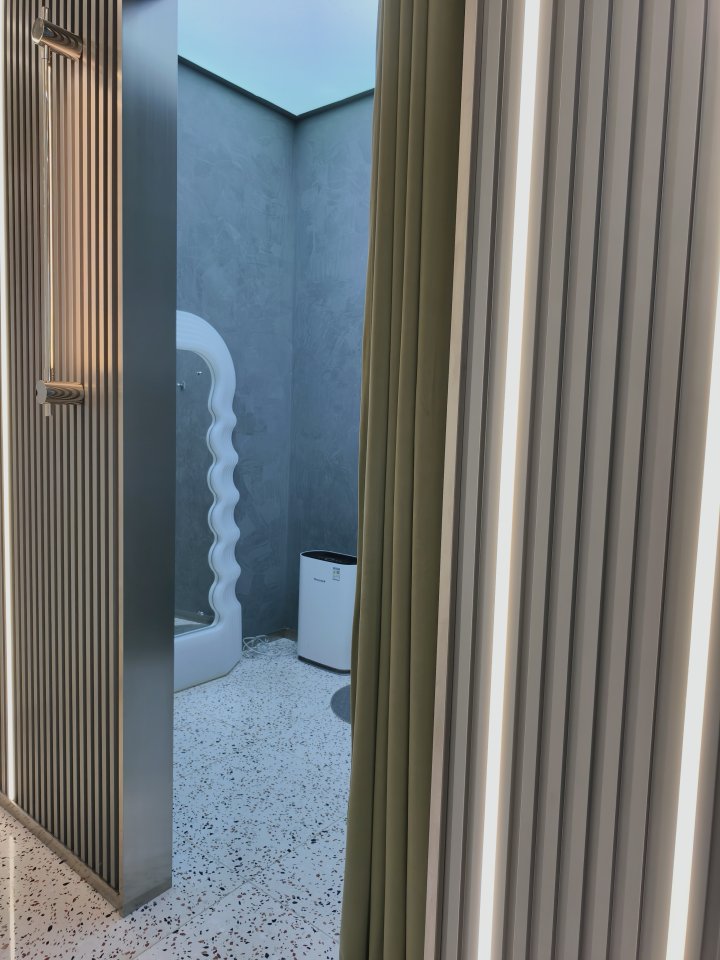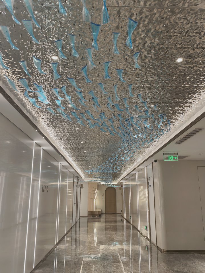 厕所的设计也很有巧思,过道天花板用波纹金属板搭配蓝色玻璃,打造出“海底鱼群”的视觉效果,走进去像穿越小隧道。