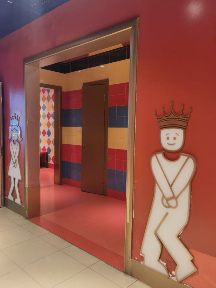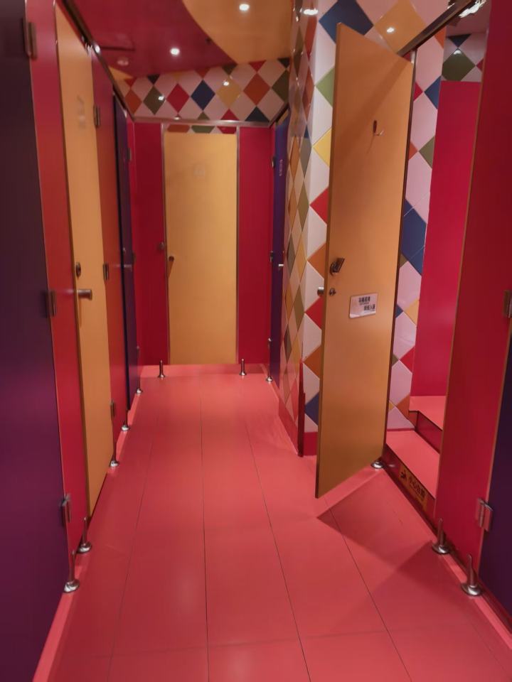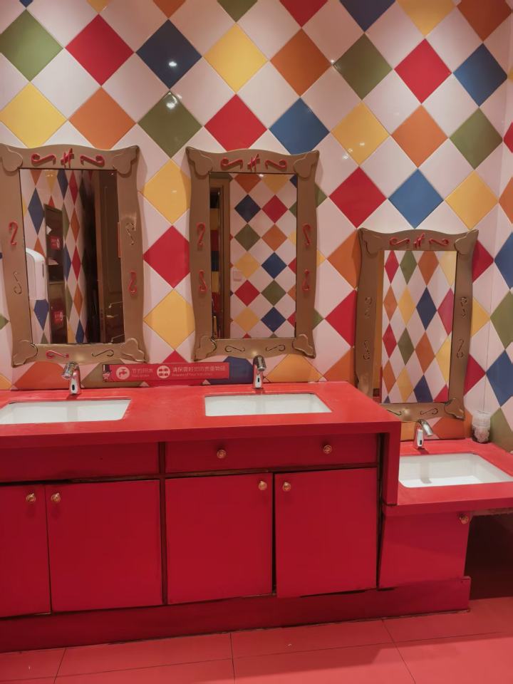 记者刚走到门口,就被红、黄、蓝撞色的彩色菱格瓷砖吸引,男女厕所入口分别画着戴皇冠的公主、王子卡通剪影,代替了原有的男女厕所标识,洗手区是鲜红色台面配复古造型镜框,厕区隔间以红、橙、紫撞色打造,很有童话氛围感。